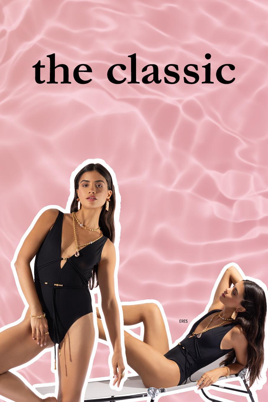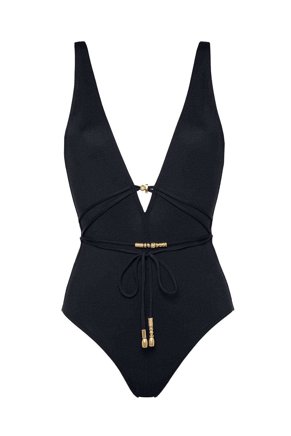 Understated and commanding. A jet-black one-piece with gold hardware, pair it with a fluid metallic knit coverup, and minimalist gold sandals.