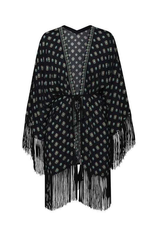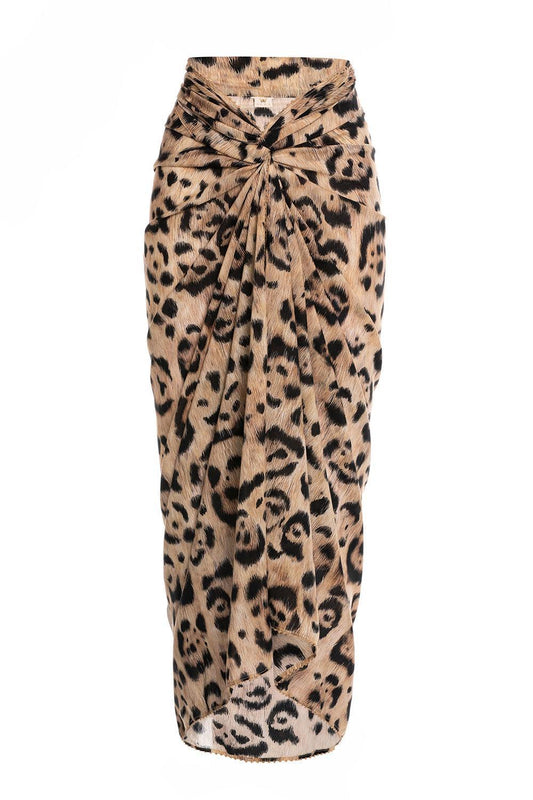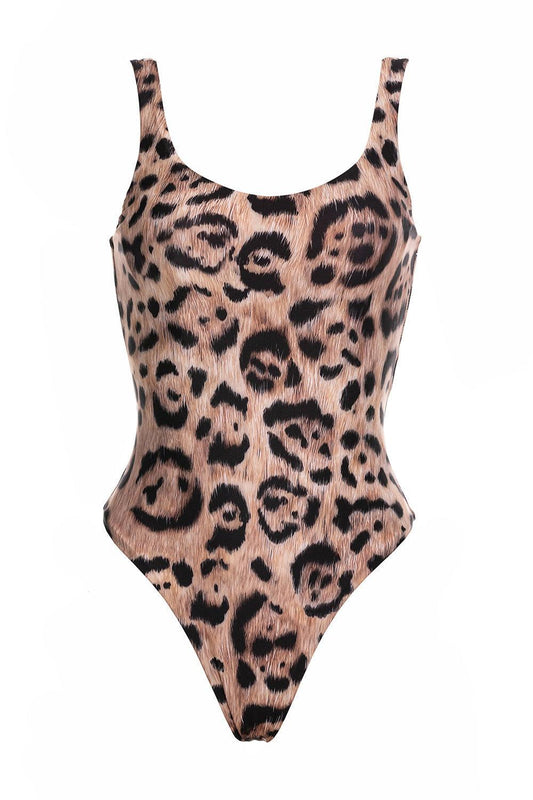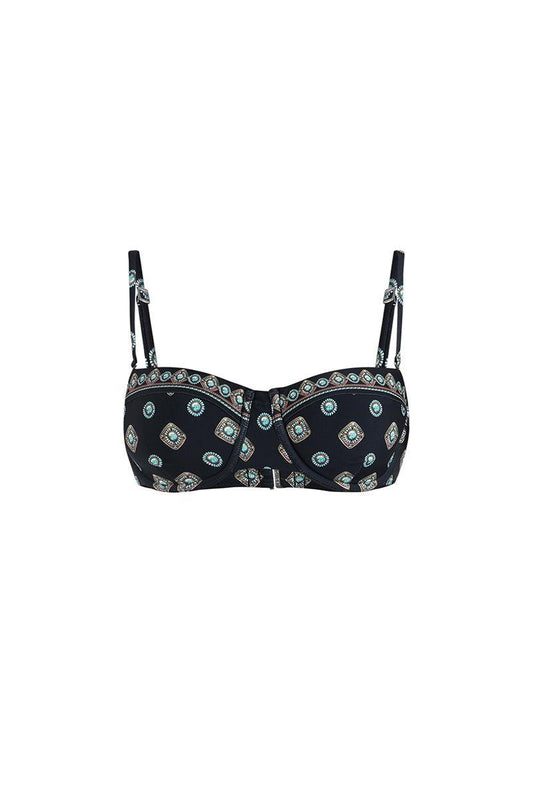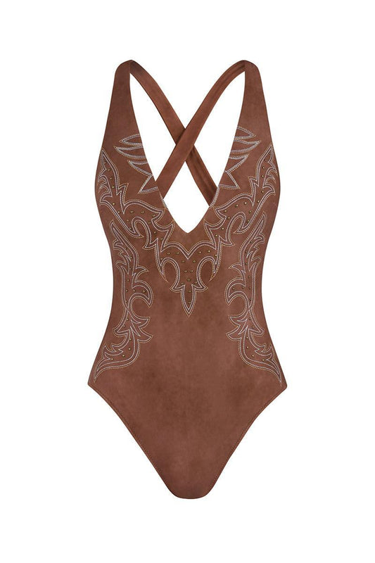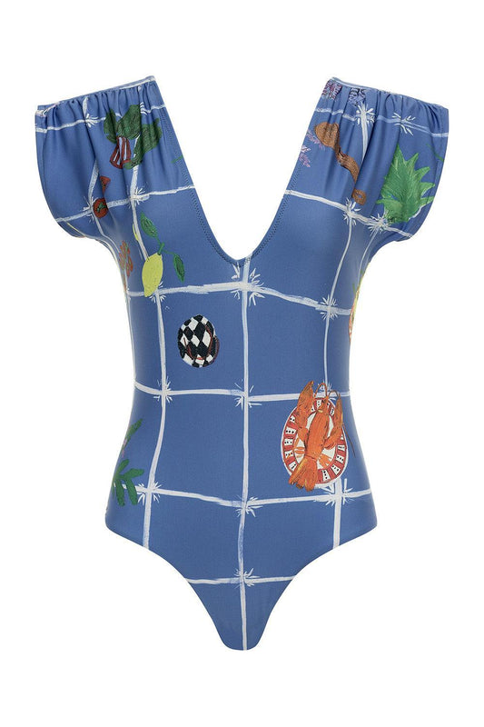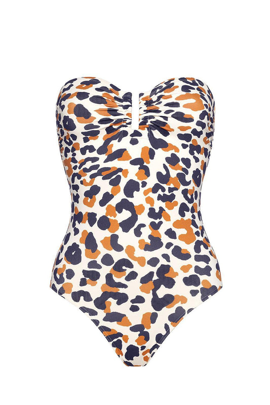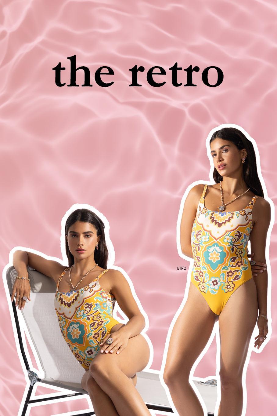 A revival of sun-drenched glamour. This printed single-piece suit evokes vintage resort wear through saturated ochre and turquoise hues.