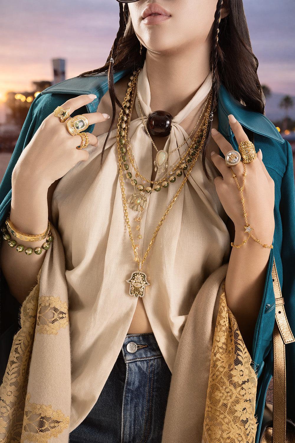 Keep it neutral with classic gold and diamonds. Choose a modern hoop—they complement almost any outfit. Add a sleek bangle to enhance your existing bracelet stack. For a soft touch, go with pearls. Not only are they trending, but they also come in a range of earthy tones you can wear solo or layer into your favorite necklace mix. Finally, elevate your look with a statement ring featuring neutral-colored gems like diamonds, topaz, or quartz.