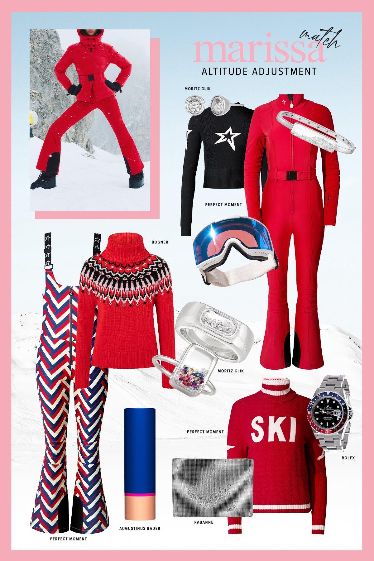 Perfect Moment’s red ski suit is built for movement against winter light. Dial in the snow-white shimmer with Moritz Glik’s circle stud earrings, and add striped goggles to sharpen visibility & attitude all in one sweep.