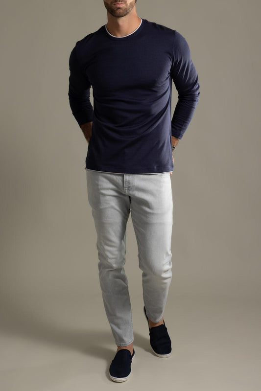 A navy suede overshirt, sand-washed linen, and ivory drawstring trousers create a tactile mix of contrast and relaxed structure. Desert-toned loafers and crisp sneakers carry him from sideline mornings to evening reservations without missing a beat.