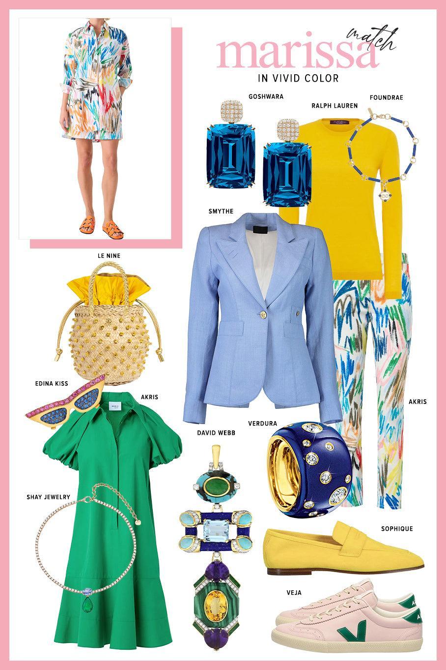 The Veja volley sneaker, David Webb turquoise jade totem necklace, and Le Nine nina crystal bag bring a warmer edge. Shay Jewelry’s emerald and sapphire diamond drop tennis necklace and the Edina Kiss sapphire sunglasses pendant add another dimension of vivid color.