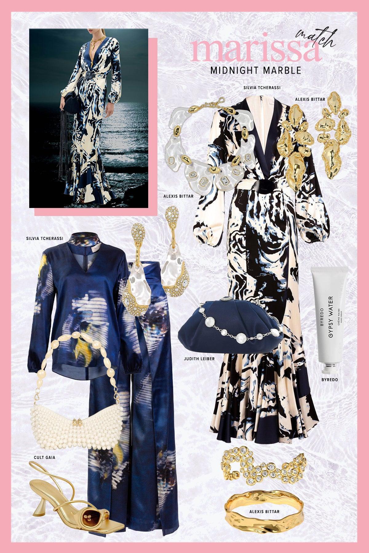 Silivia Tcherassi's Canturipe draped wide-leg trousers and matching silk blouse create a coordinated set that moves like painted silk in motion. Cult Gaia’s Mercier beaded bag in ivory and Ria sandal in brass introduce a bright counterpoint tomoodymidnightmarble.Alexis Bittar’s pavé pebble drop earrings echo water’s reflective pull, catching thelight with a soft, liquid Lucite shine.