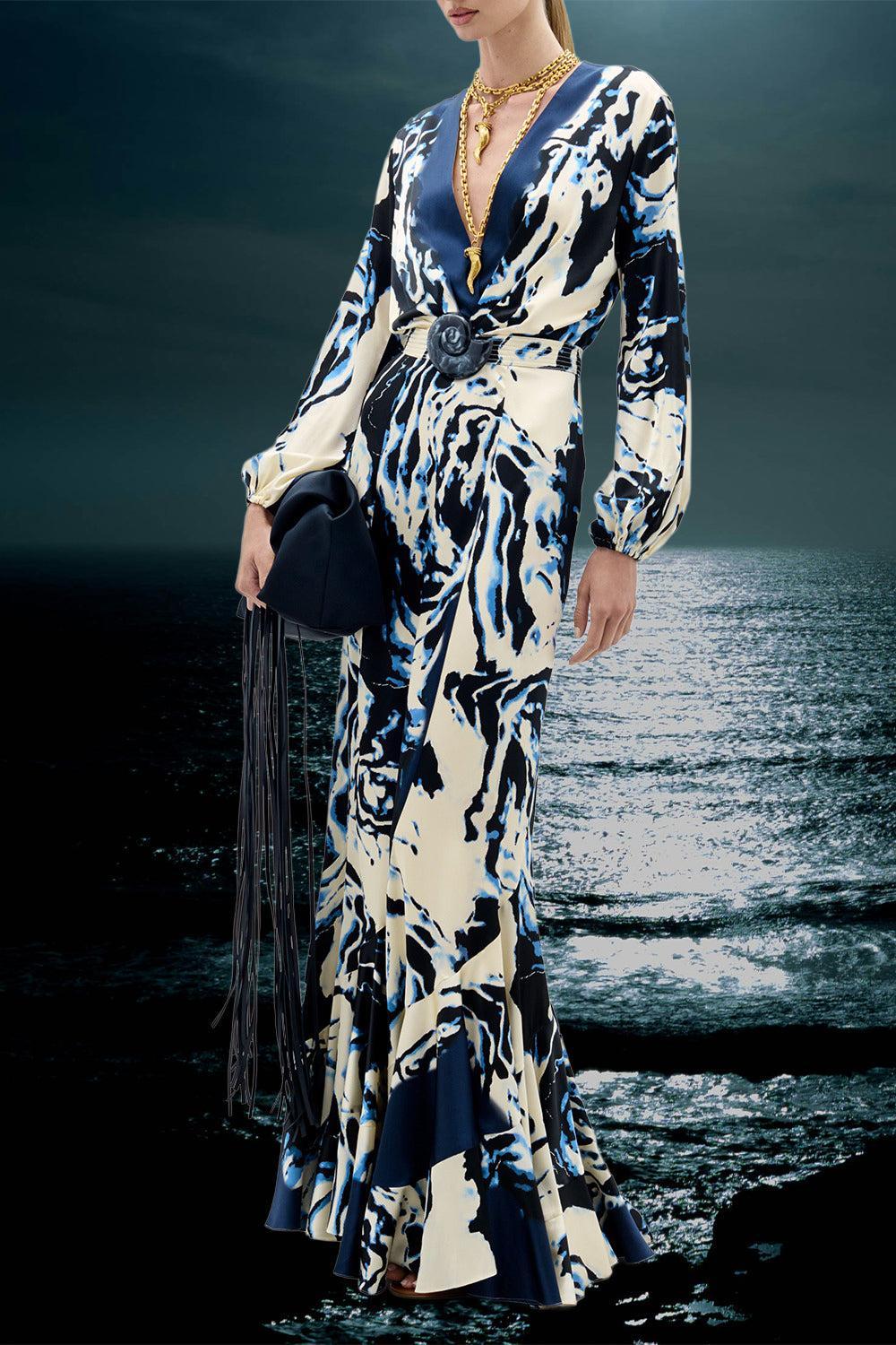 Silvia Tcherassi’s Remy dress in a deep-sea abstract pattern shifts between navy and cream with every step, including a removable belt for cinched structure or fluid drape. Alexis Bittar’s Liquid Lucite necklace and Brut Mosaic earrings bring a luminous lift near the face, while Judith Leiber’s Gemma satin clutch draws out the gown’s shadowed undertones. Byredo Gypsy Water adds an element of smoky woods, cool air, and wanderlust.