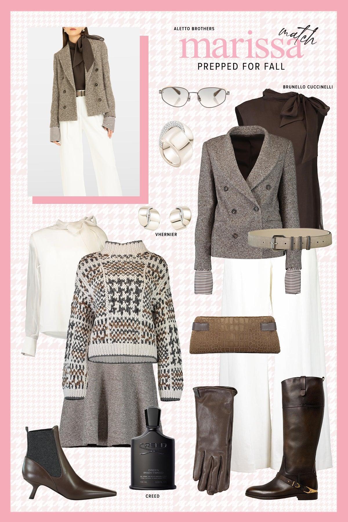 Heritage codes are recast through collegiate layers: the Prince of Wales opera sweater draped over a crispy bow blouse pairs with a herringbone mini circle skirt. Kitten-heel ankle boots and shiny biker channel equestrian tradition, while Creed’s Green Irish Tweed becomes the olfactory signature.