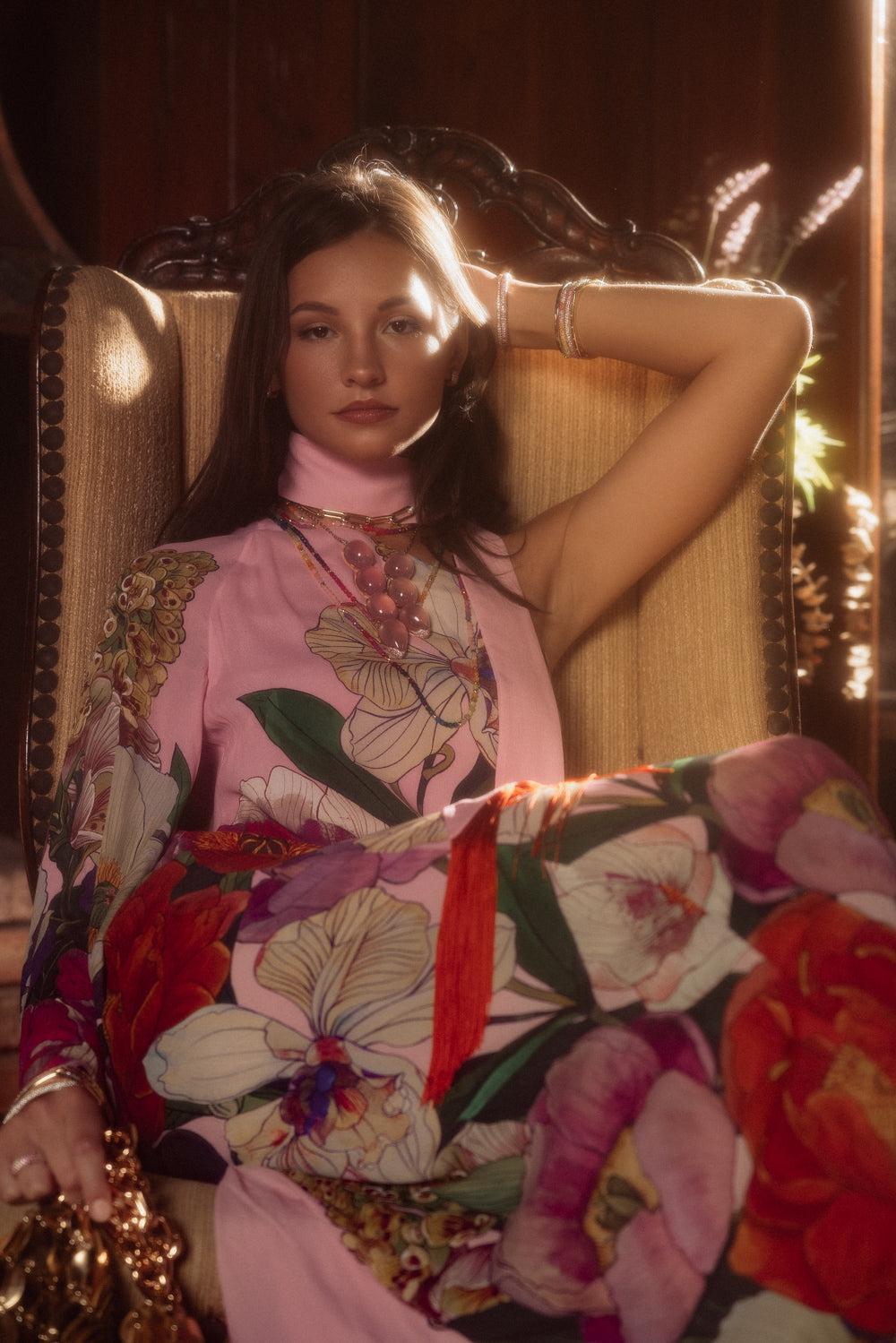 Lace, floral silk, and saturated prints introduce a mood that’s richer, more evocative. Off-the-shoulder tailoring and asymmetric lines meet vintage-inflected accessories for a look rooted in character, presence, and place.