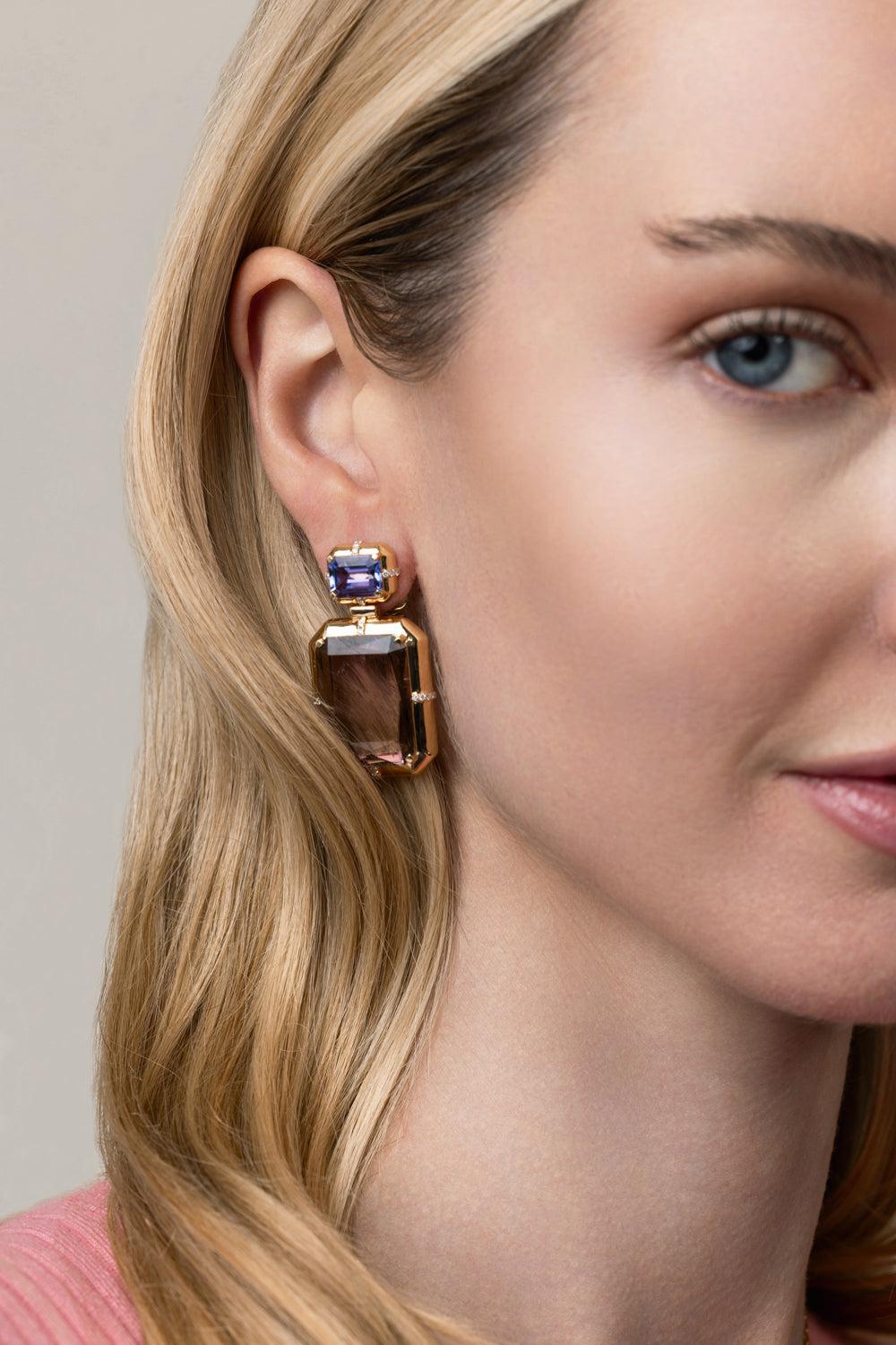 Goshwara two tier tanzanite tourmaline g-one earrings in yellow gold.