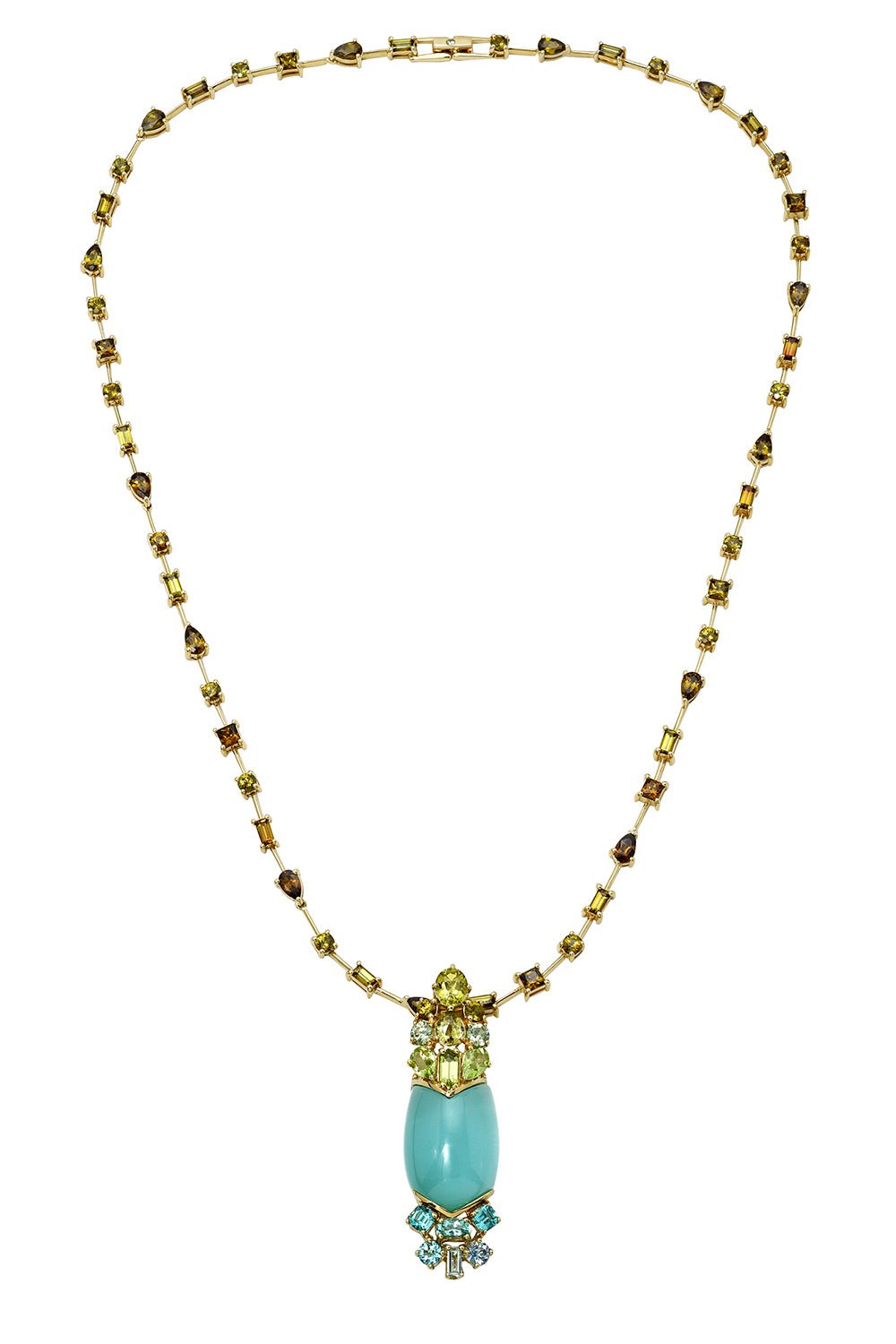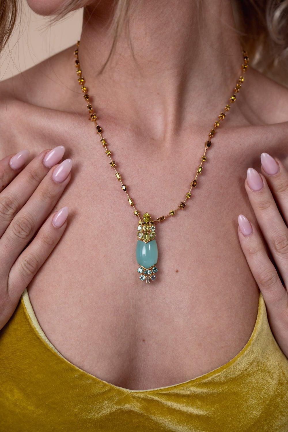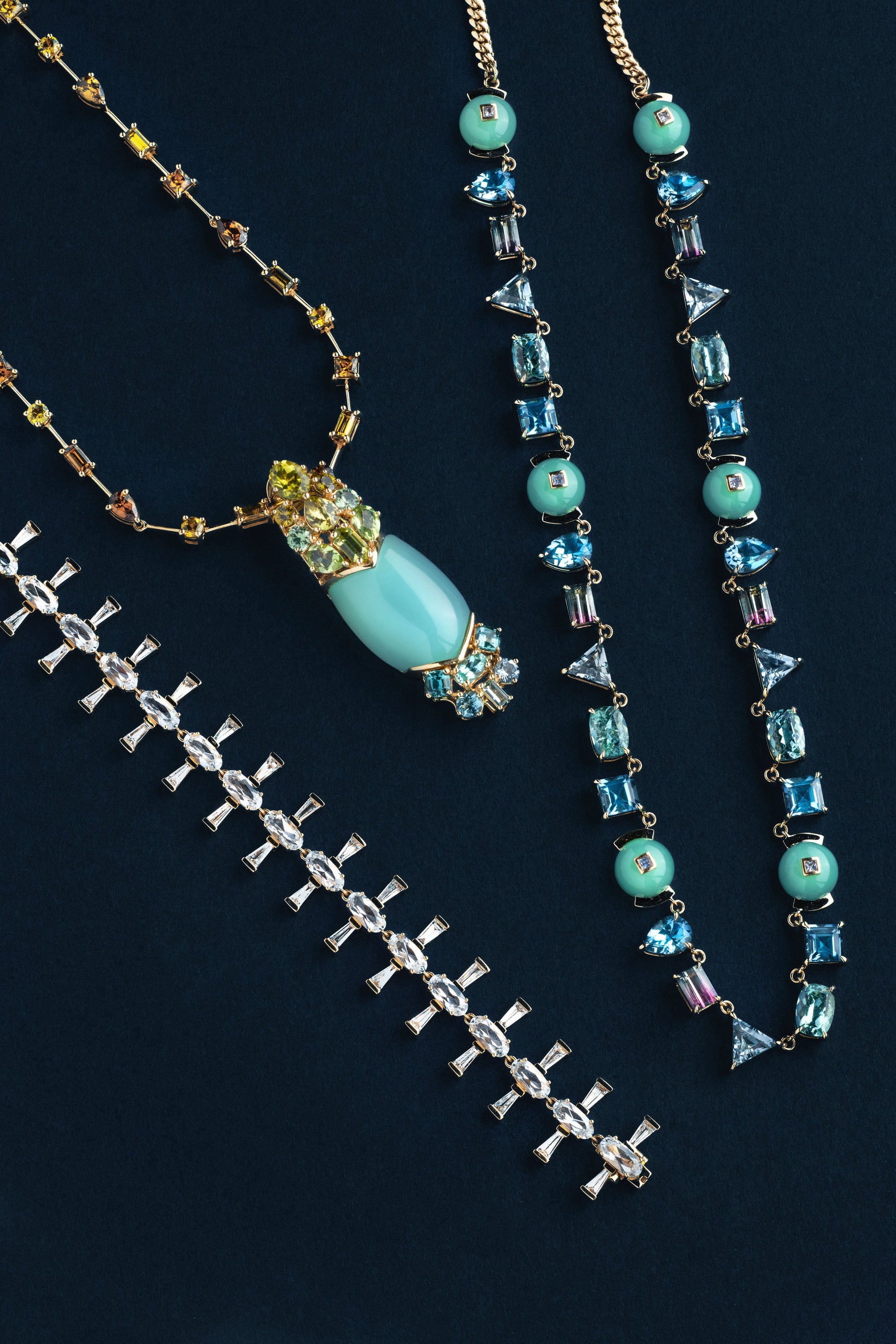 1.59 cts of Canary Tourmaline, 1.45 cts Seafoam and Aqua Tourmaline, .16 cts Seafoam Neon Beryl, .9 cts Mali Garnet, .09 cts Aquamarine, .26 cts Andradite, and 1.4 cts Peridot 5.2 cts of Andradite Garnet in Tennis Necklace 11.88 cts Chrysoprase