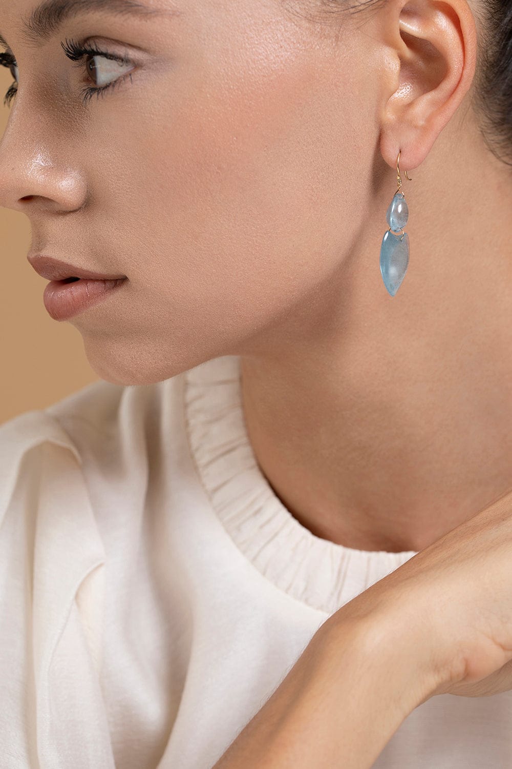 Ten Thousand Things double heart aquamarine earrings. Hand Cut Stone Double Heart Earrings 18-Karat-Gold Earrings.