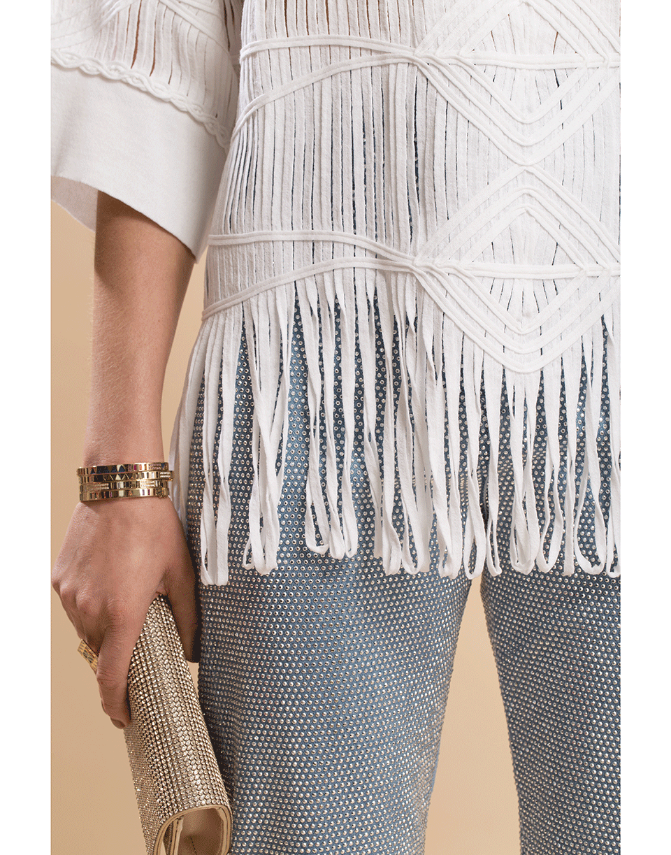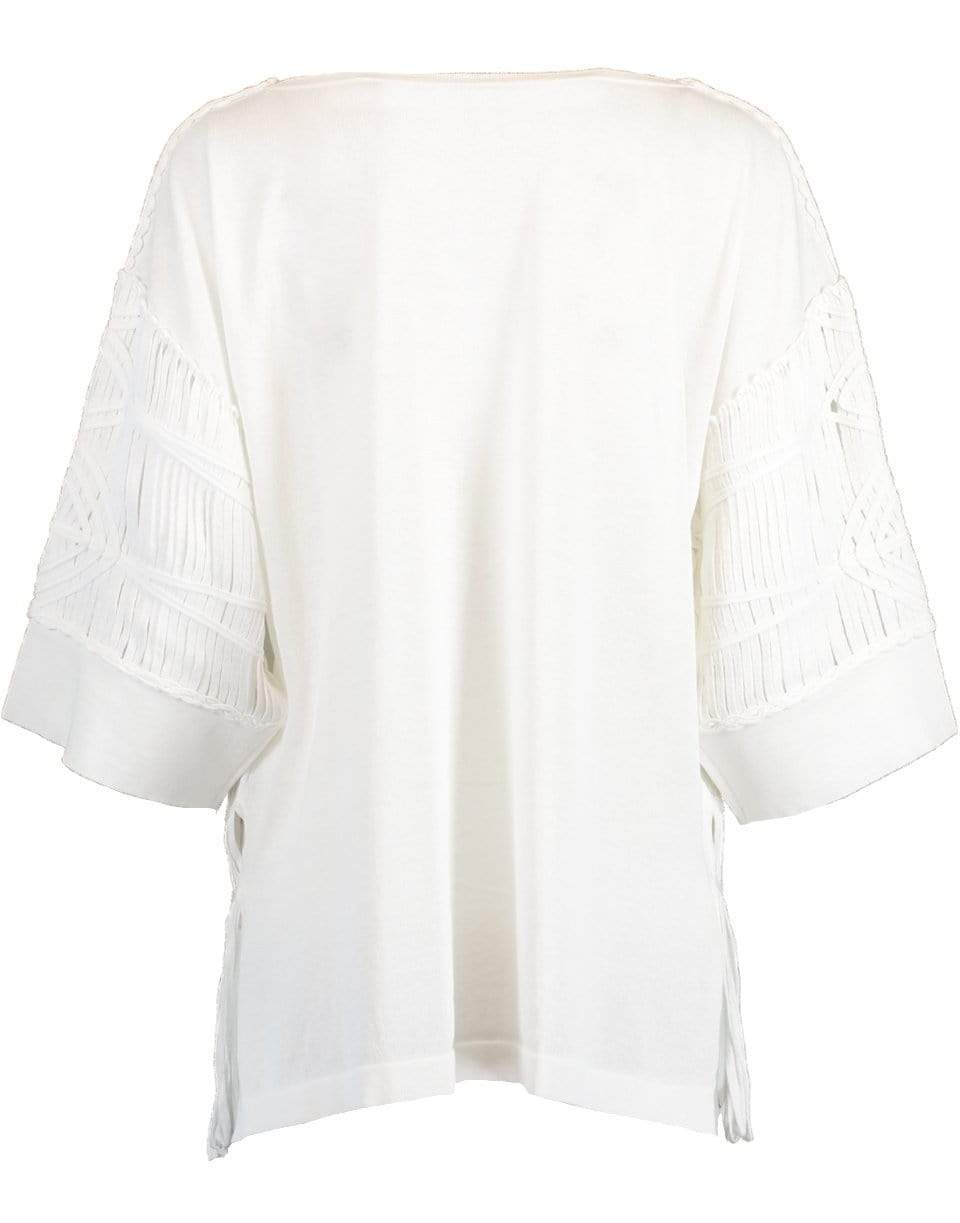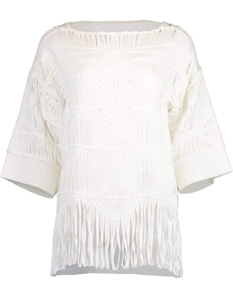 Blumarine fringe top with 3/4 length sleeves, round neck, and a relaxed fit.