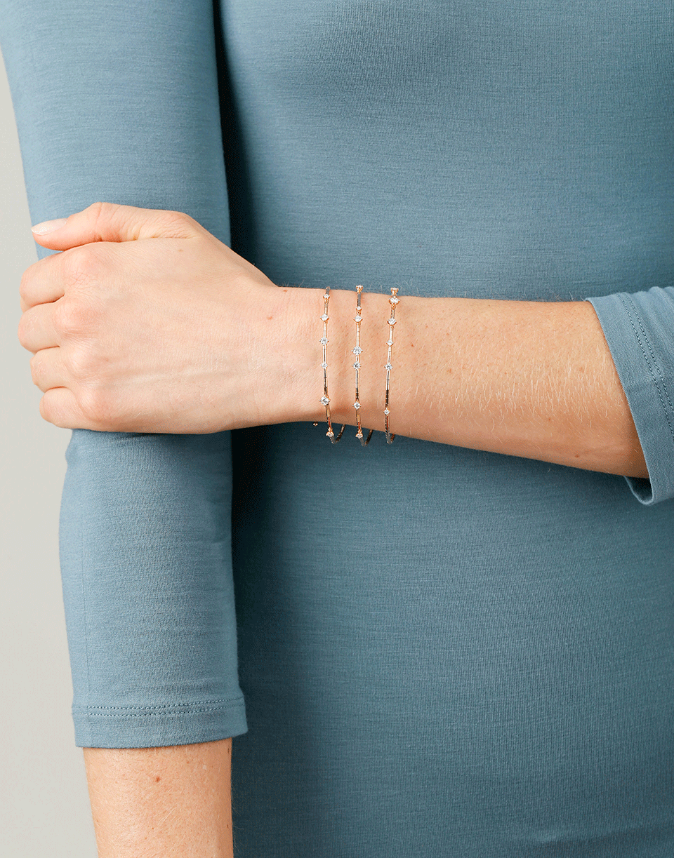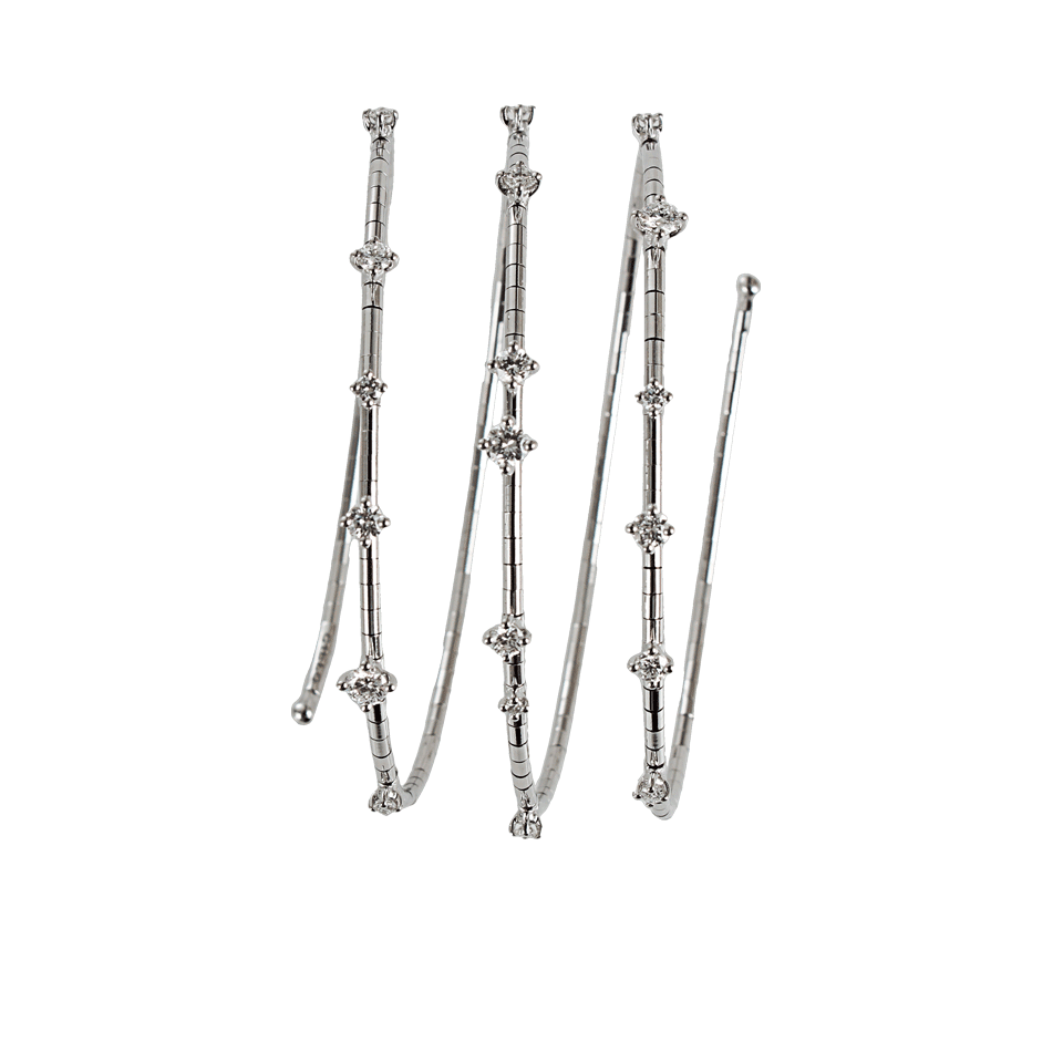 With diamonds sprinkled on its slim titanium spring like morning dew drops, Mattia Cielo's 3-circle rugiada bracelet is delicate beauty. Extremely light-weight and winding around your wrist in snake-like fashion, this accessory is not only exquisite, but distinctively innovative. Be the first to show off its unique design.