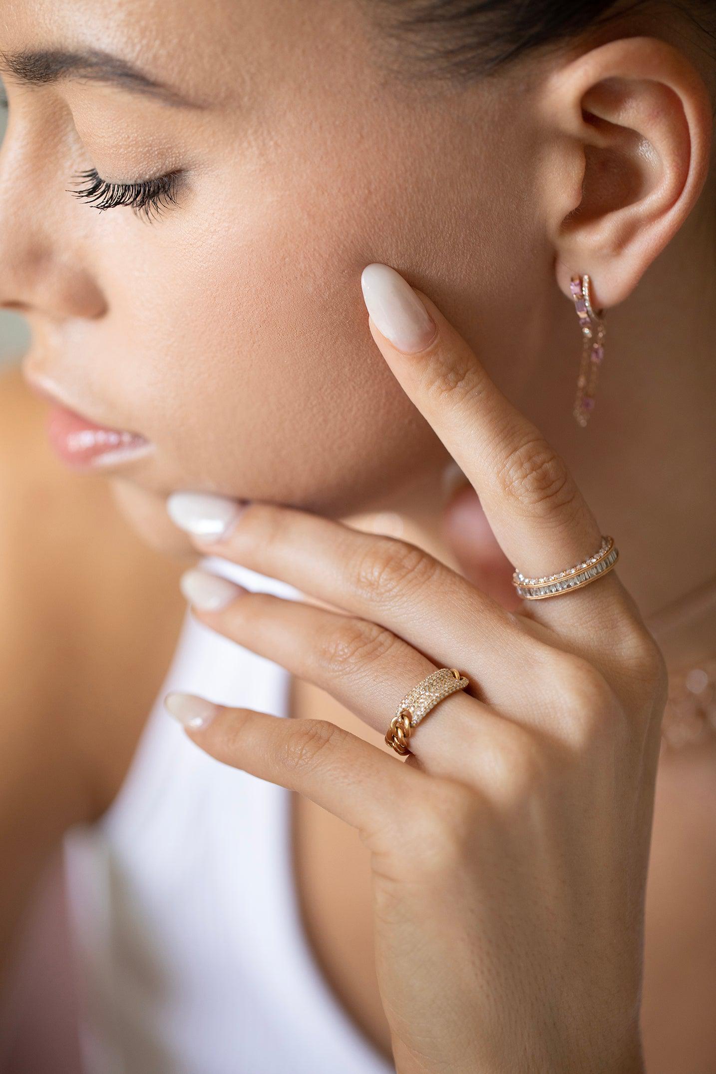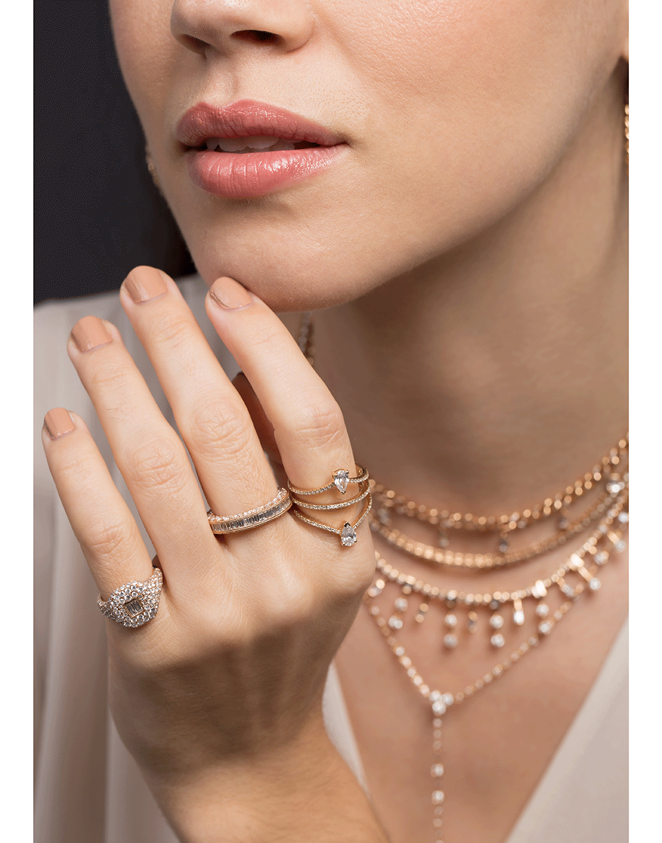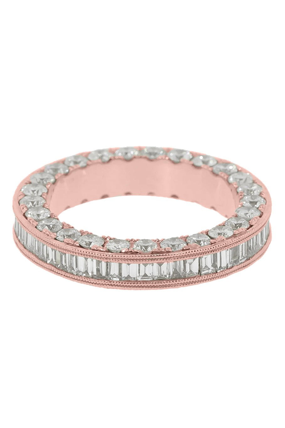 Three sided 18k rose gold eternity band with a baguette diamond center from Shay Jewelry.