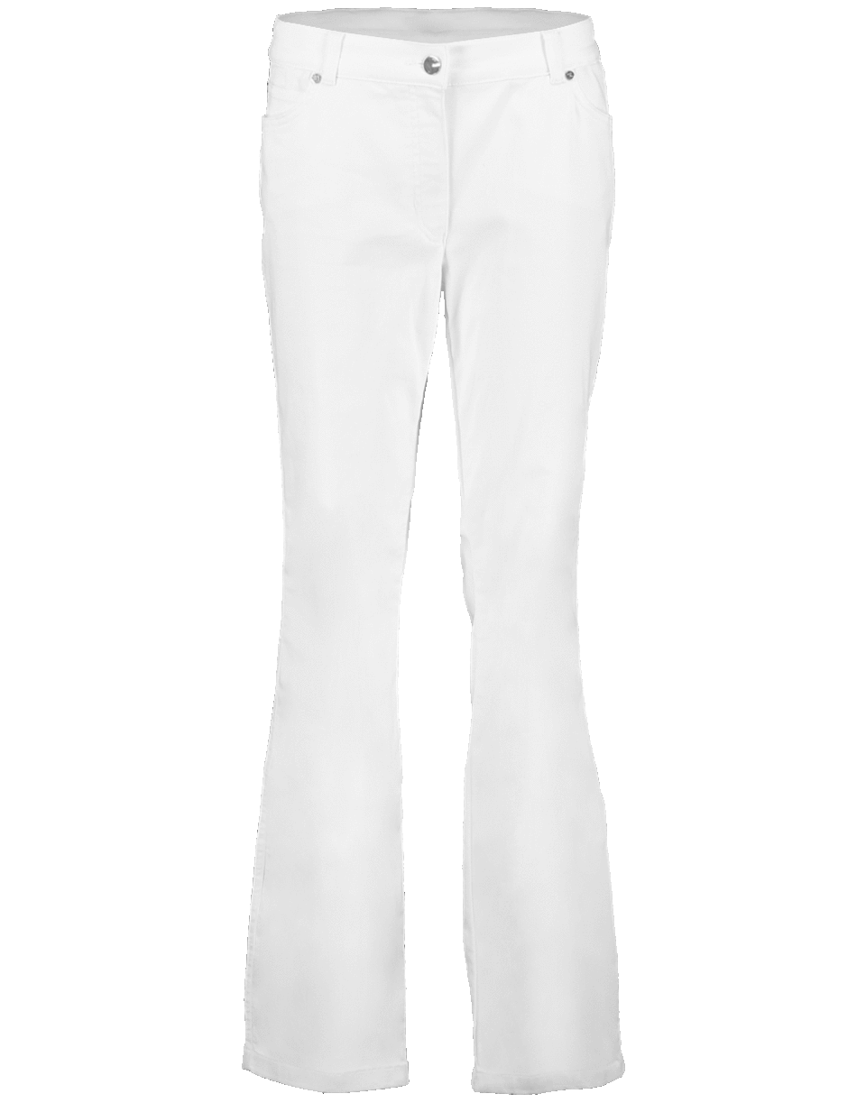 White flared jeans by Escada. These 5-pocket white denim jeans feature a mid-rise, front zipper with button front, silver hardware, belt loops and a slightly flared bottom.