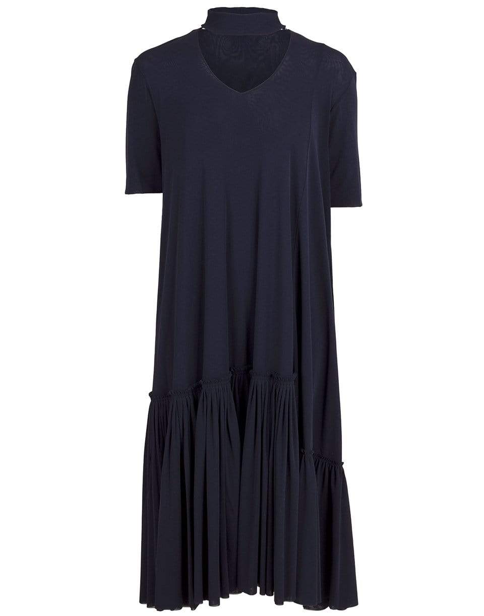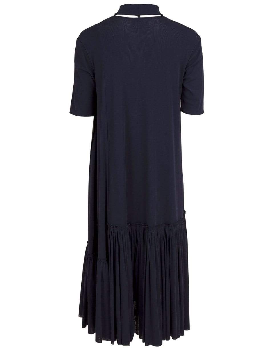 Jil Sander navy A-line stretch tulle dress with elbow sleeves, a pleated hem, turtleneck, and a midi length.