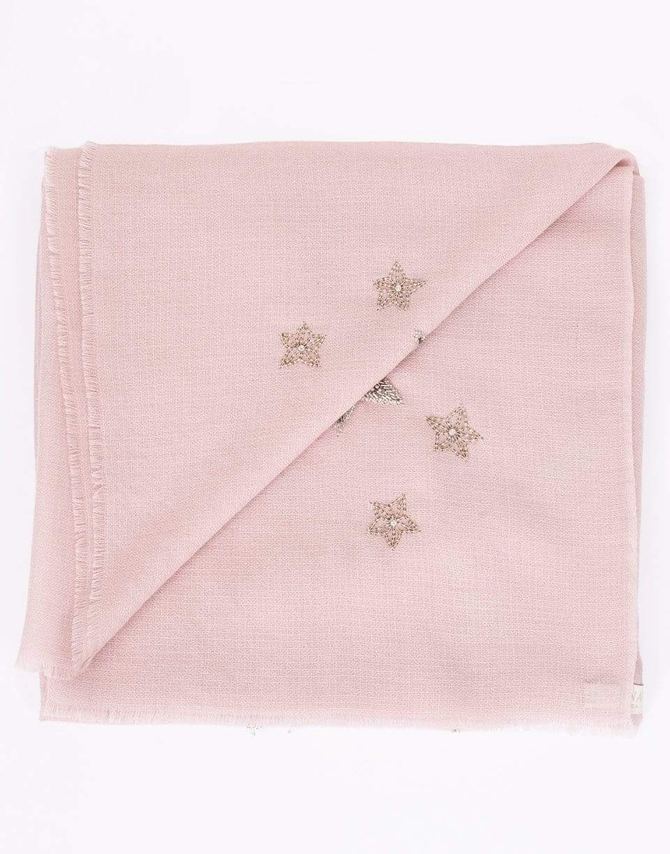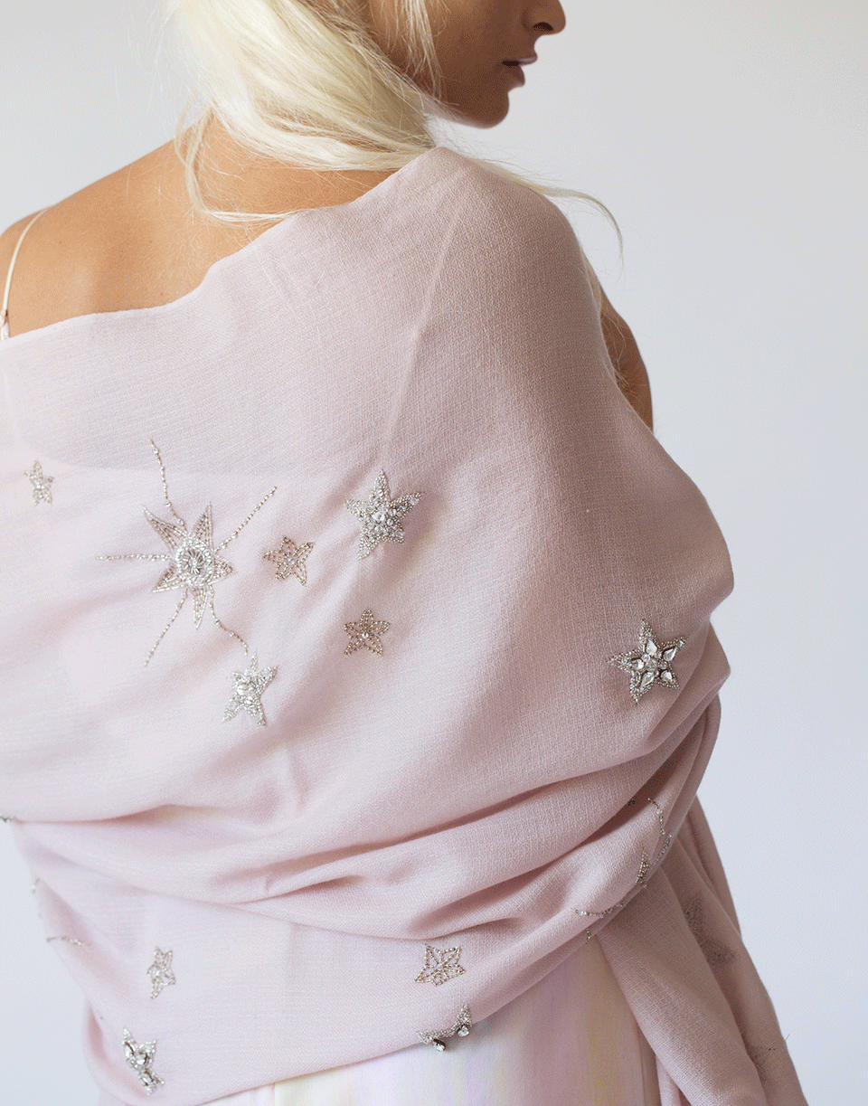 The Starry Night scarf from K. Janavi creates a shimmering motif with layers of sequins on soft cashmere. It is handcrafted in India by local artisans who specialize in the use of embroidery and embellishment.