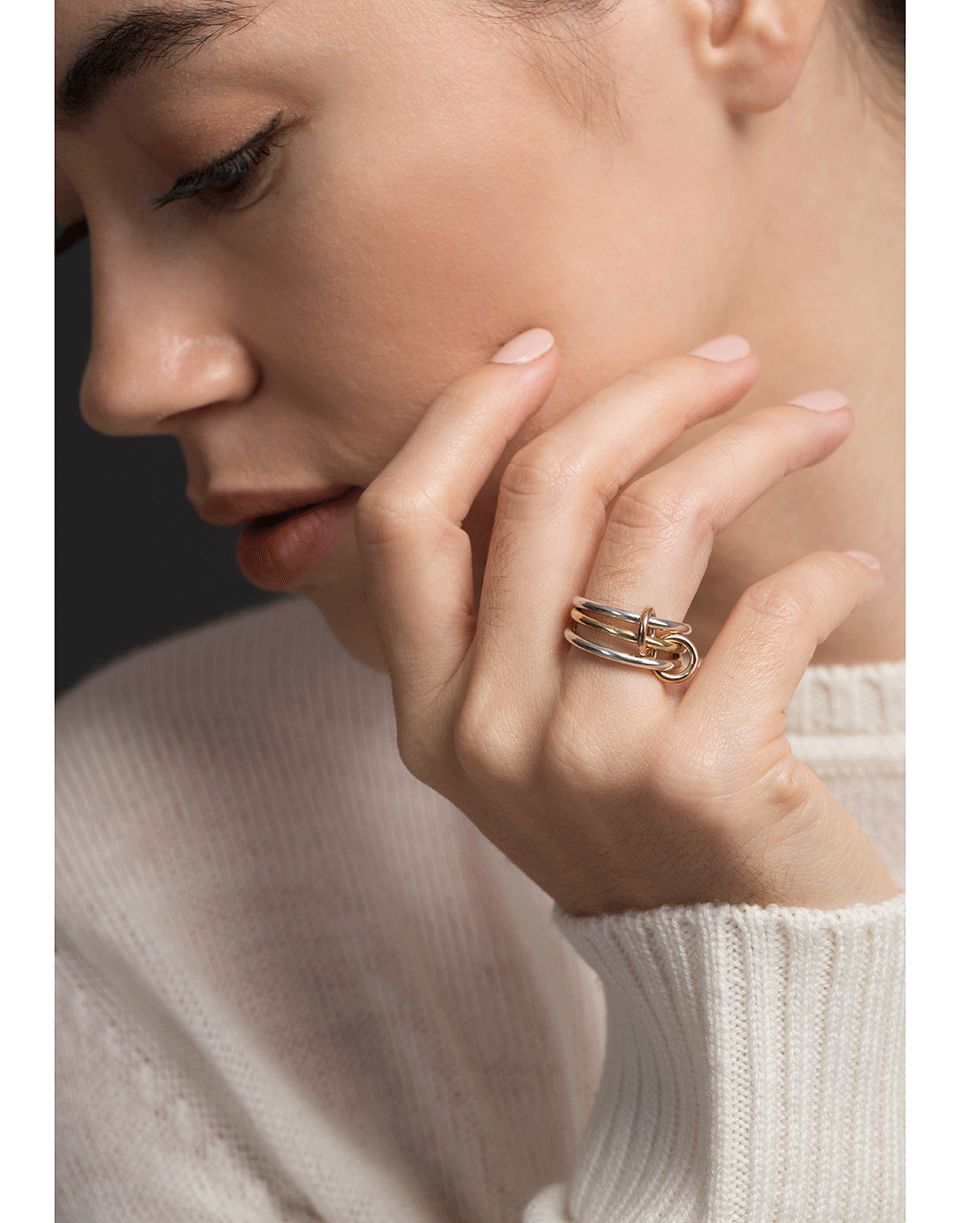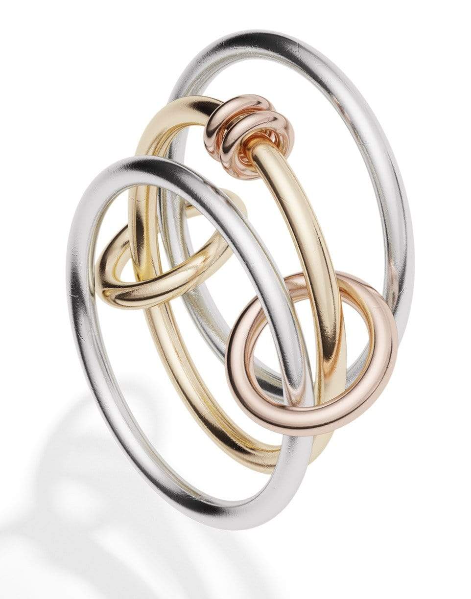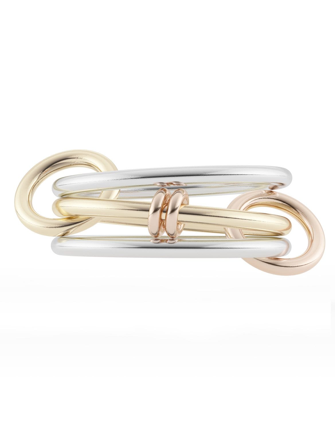 Spinelli Kilcollin Acacia three linked rings in sterling silver and yellow gold with mixed gold connectors and rose gold accents.