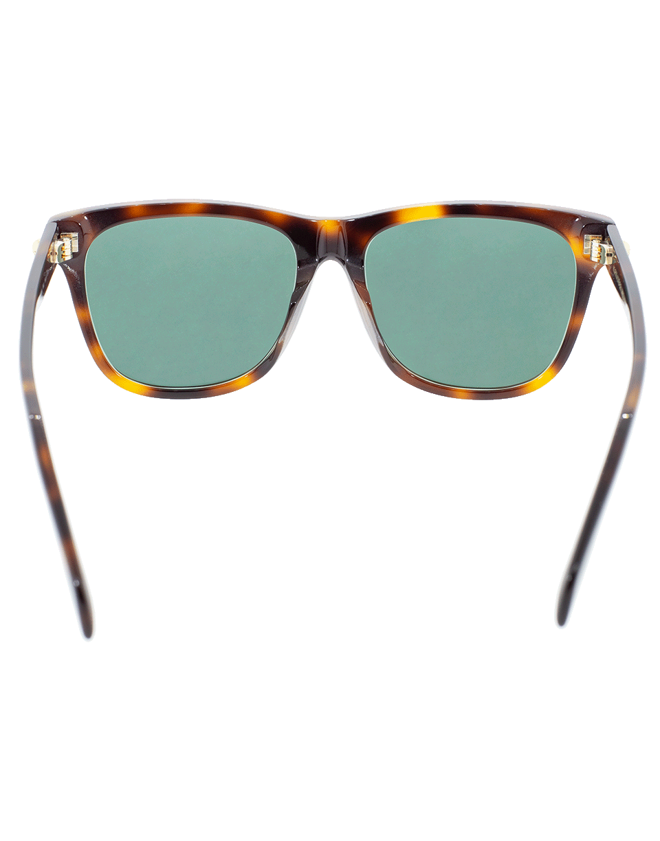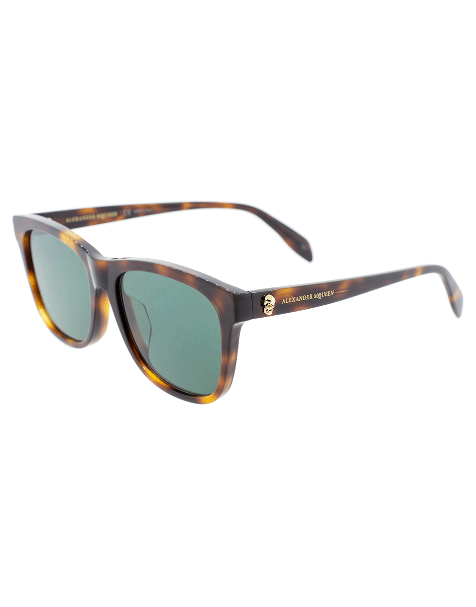 Tortoise shell acetate sunglasses by Alexander McQueen. These unisex frames feature a square silhouette with green lenses and finished with the skull logo on the temple.