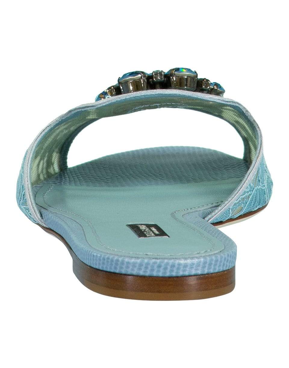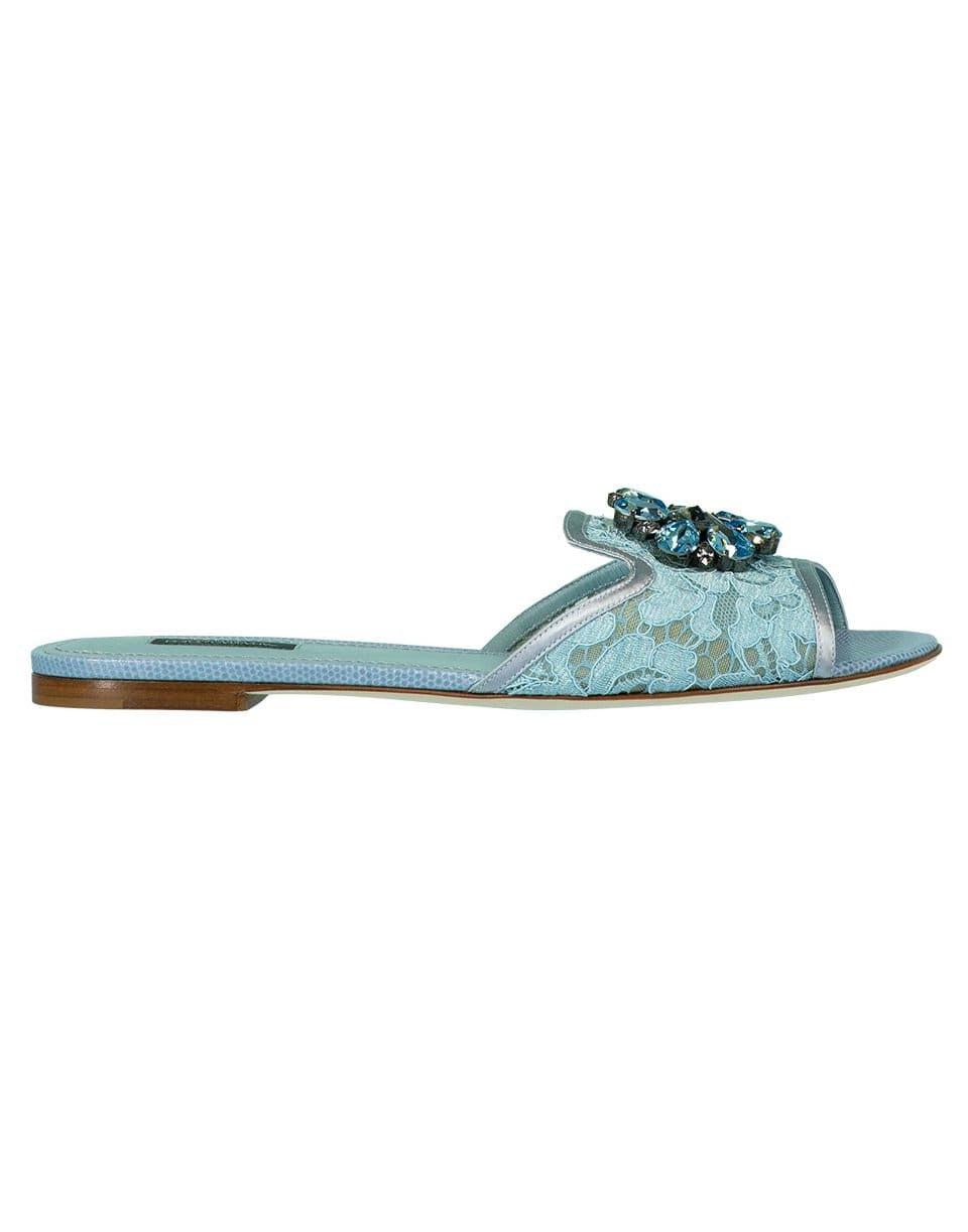 Dolce & Gabbana acqua Bianca flat sandal with a crystal jewel embellishment, elegant floral lace detail, and flat sole, slip on style and an open toe.