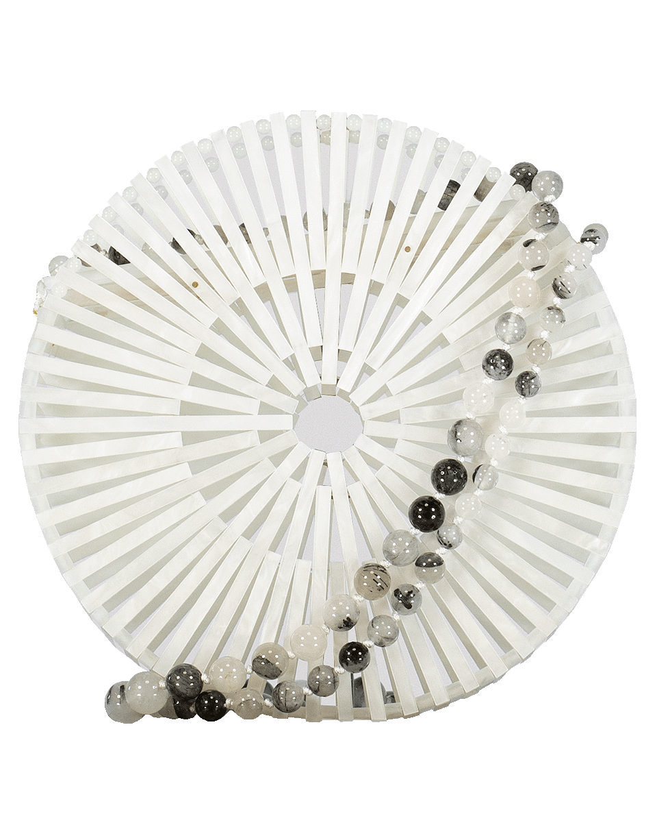 Round acrylic crossbody bag by Cult Gaia. This unlined crossbody bag features a round silhouette with cutouts and a detachable beaded strap made of stones.