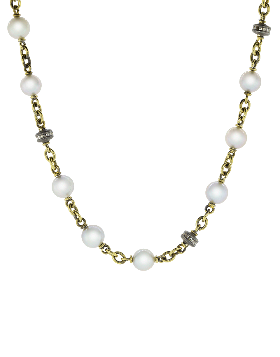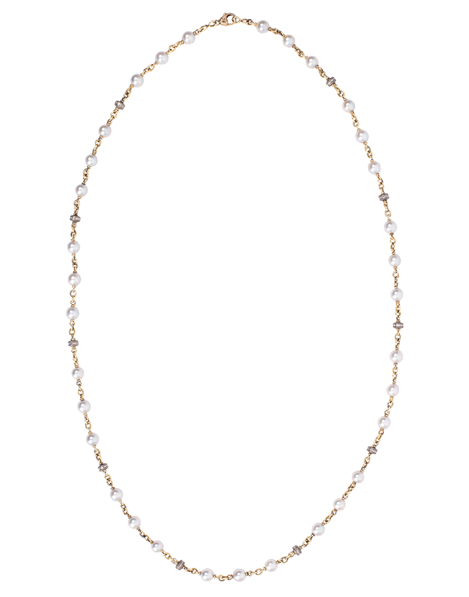 31" 18k yellow gold chain with silver Akoya pearls and diamond rondelles.