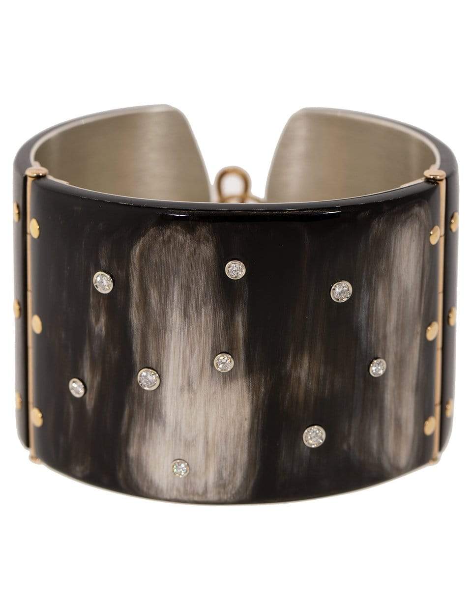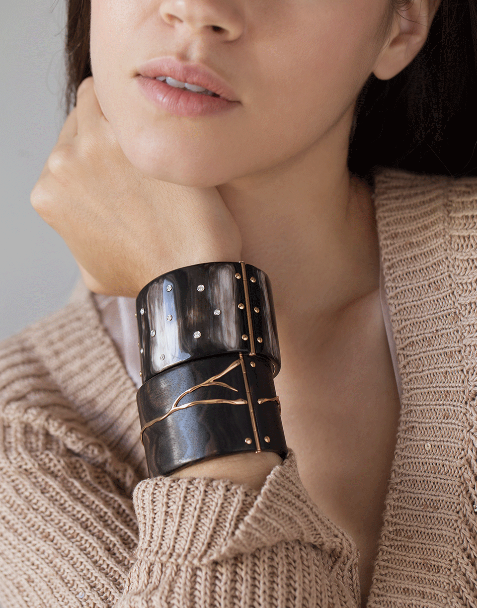 Federica Rettore Alba cuff with brilliant cut diamonds, melange black Zebu horn, and 9k gold hinges.