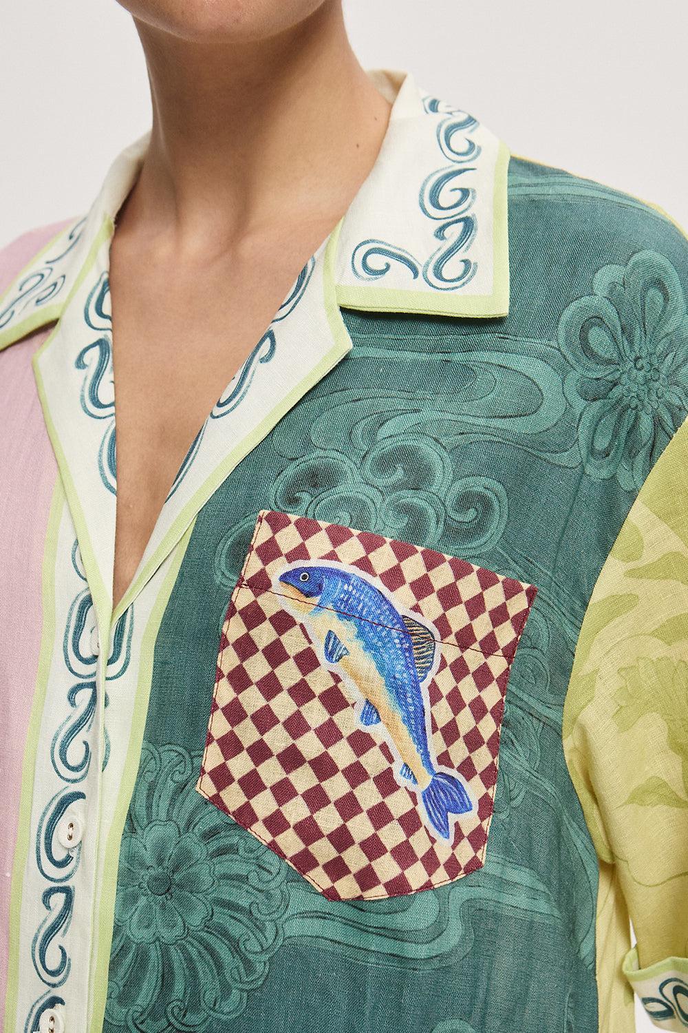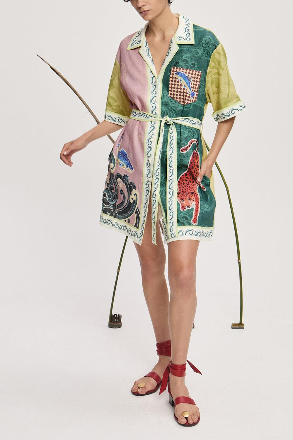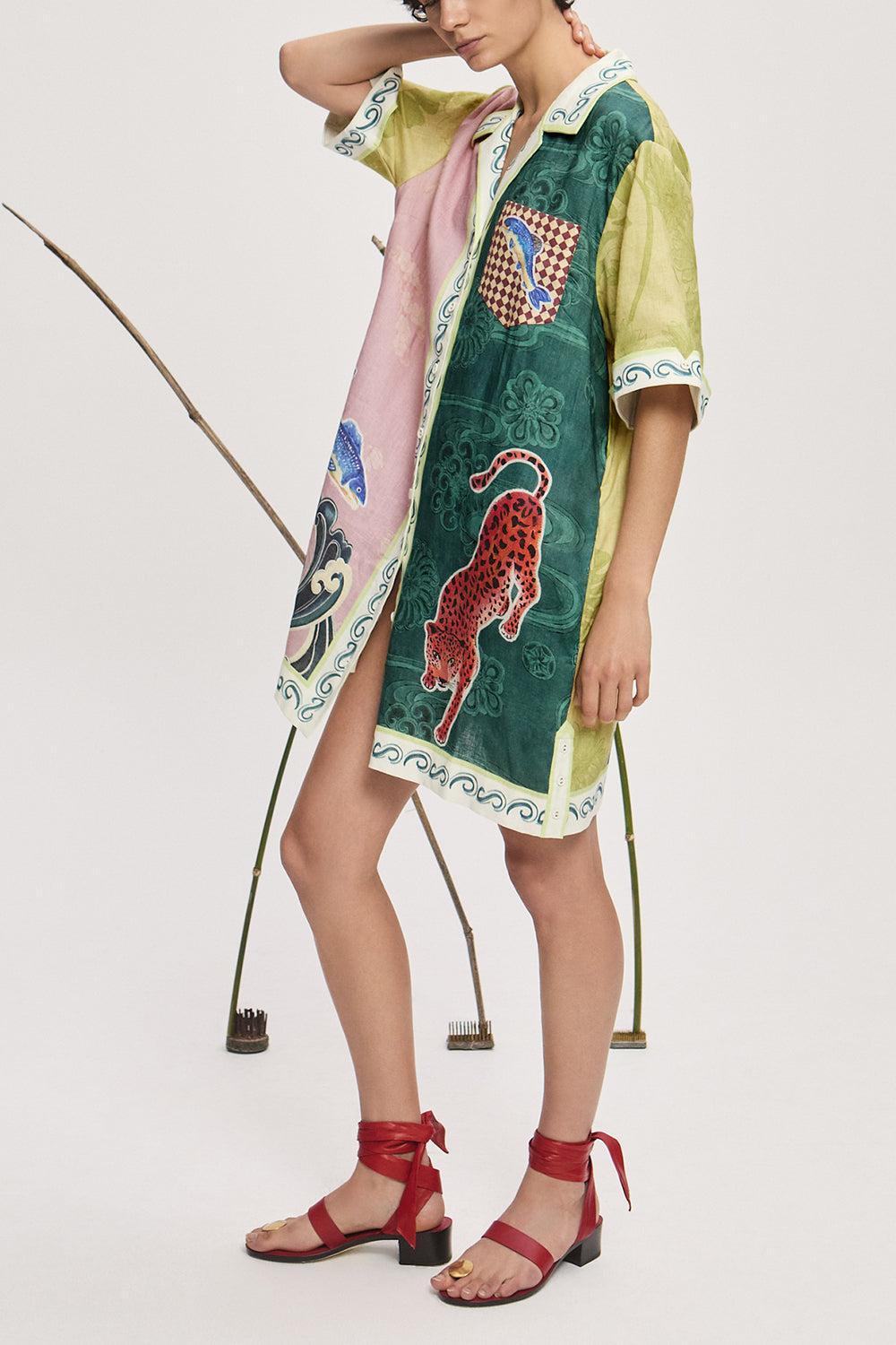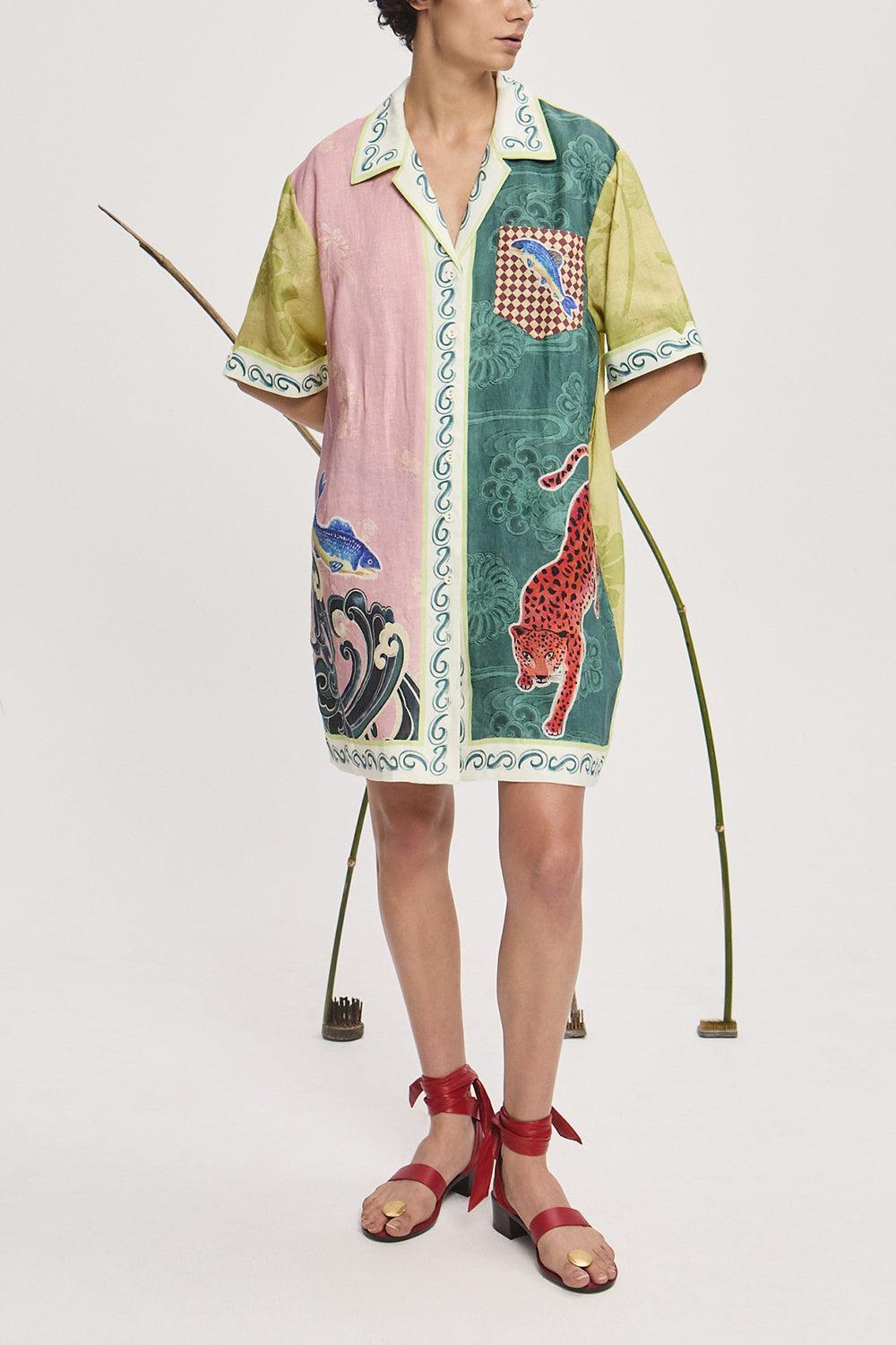 Straight Mini Shirtdress, Silhouette Pointed Camp Collar, Relaxed Cropped Sleeve, Concealed Placket With Shell Buttons, In Seam Pockets