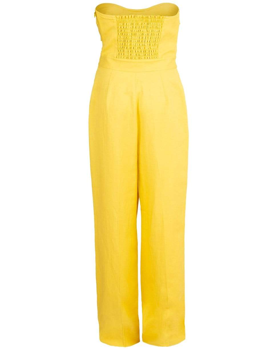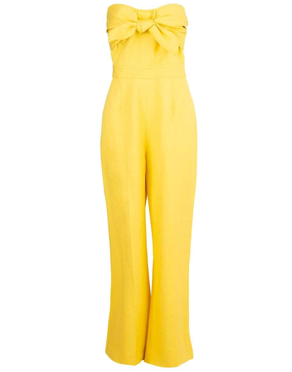 Derek Lam 10 Crosby draped linen strapless Alene Jumpsuit with a fitted bodice, bow detail at front, side pockets, shirred back, side zip closure, and a slightly flared leg.