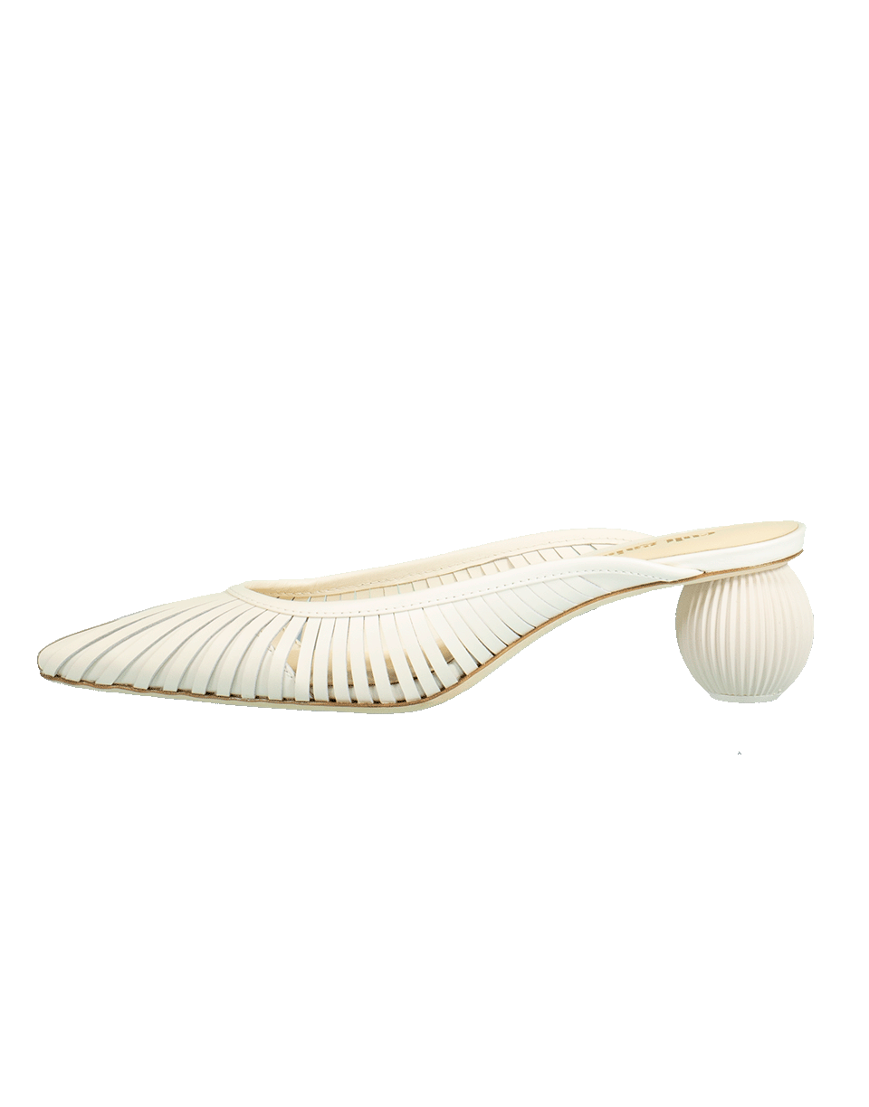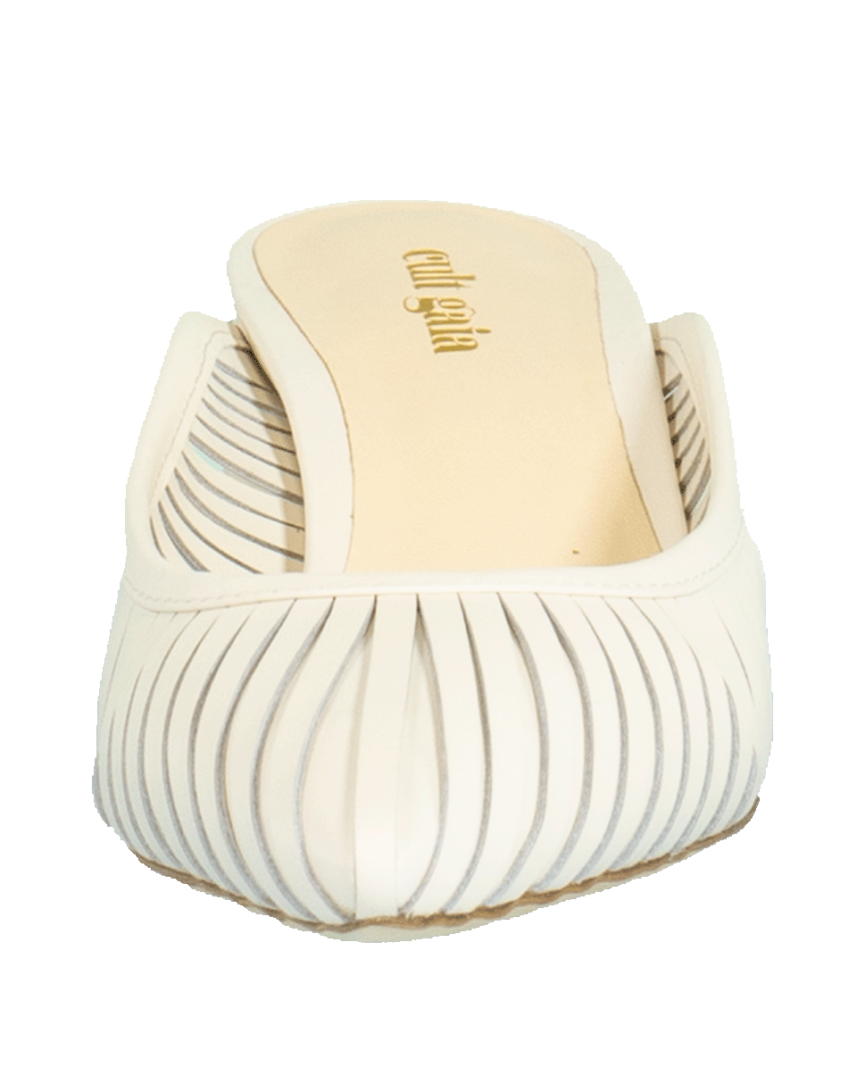 Alia round heel mules by Cult Gaia. These white low mules feature a slip-on style with a pointed toe silhouette and paneled straps set on a round 2.5” heel. All leather.