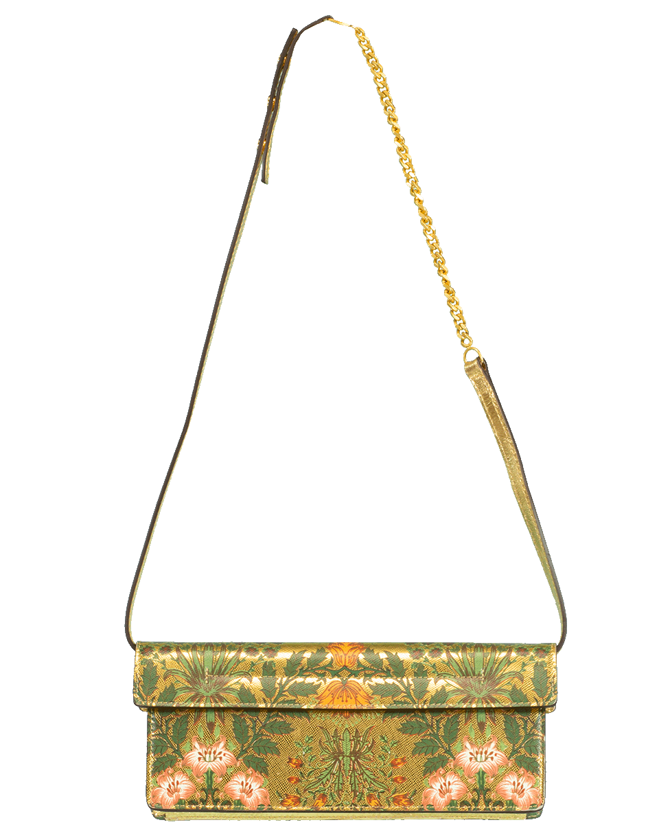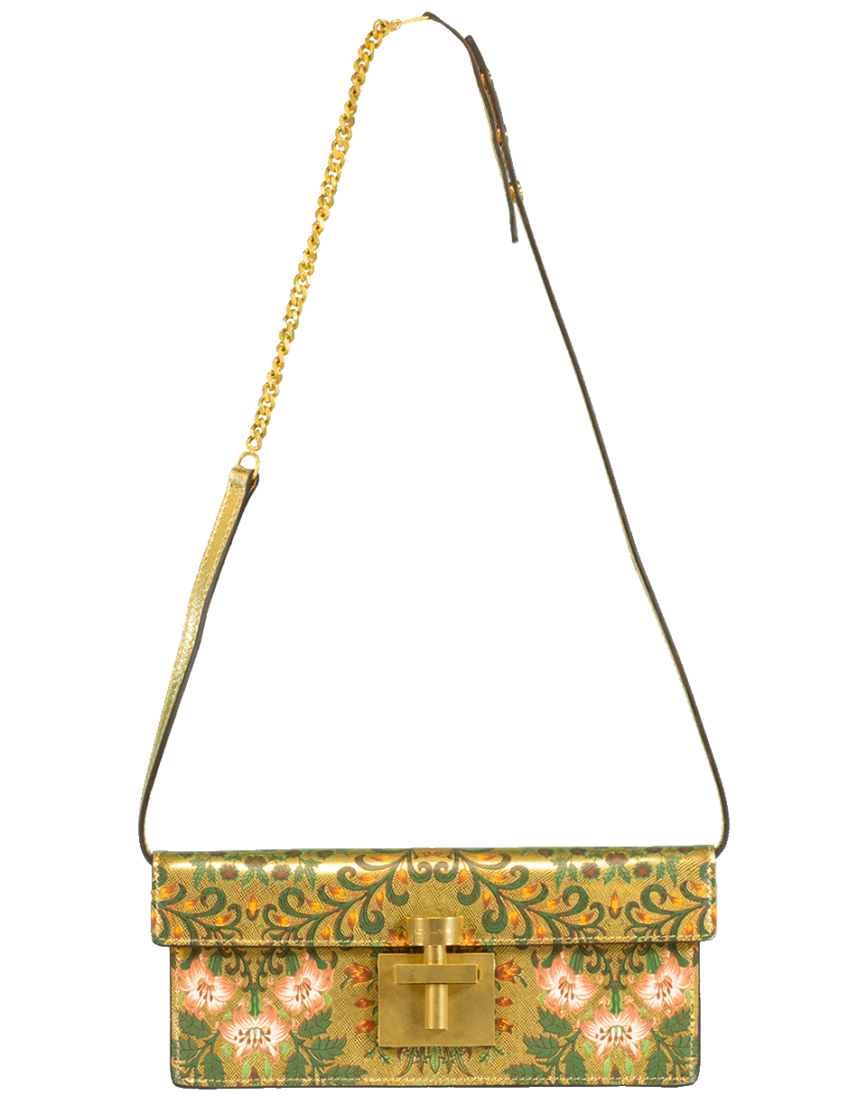 This sleek Oscar de la Renta leather ‘Alibi’ clutch features a rectangular silhouette with a floral gold print and finished with a goldtone lock clasp. Wear it with the detachable 15” shoulder strap for a hands-free look.