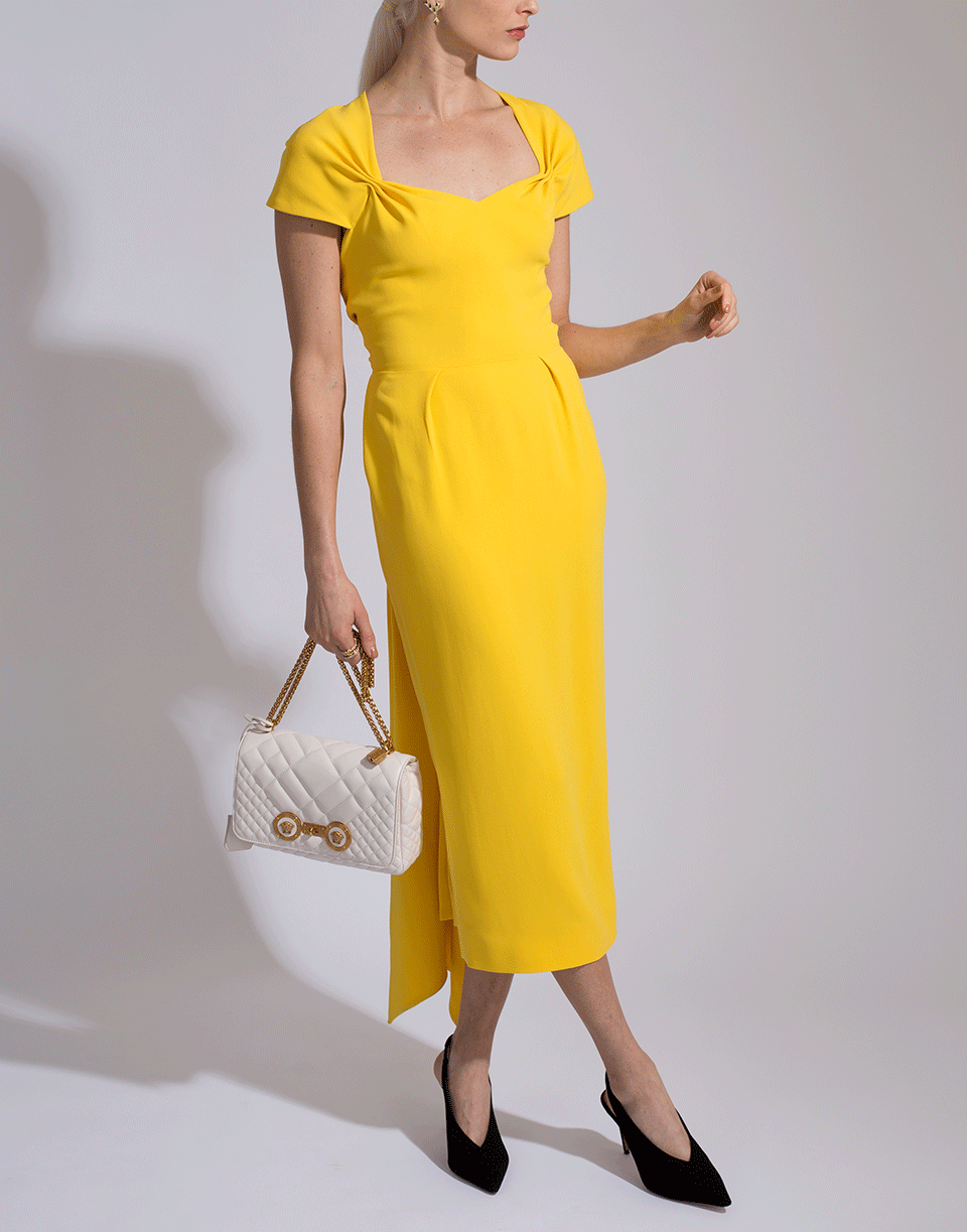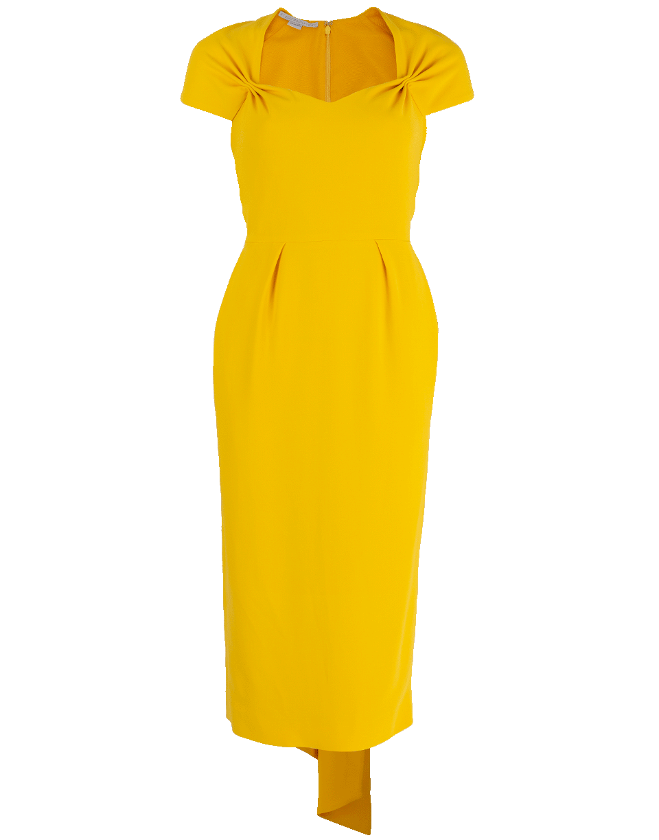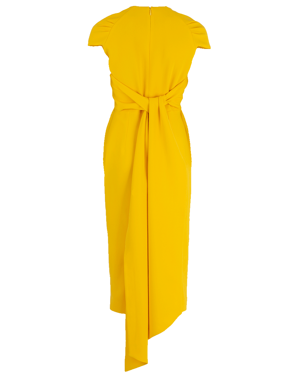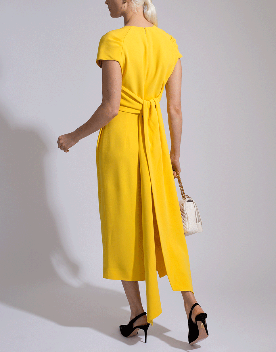 Yellow Tie Back dress by Stella McCartney. Get prepared to turn heads in this canary yellow dress. Its vintage-inspired silhouette features a clean front with darts at waist and an elongated bow that ties at the back. It offers a slim calf length cut, a sweetheart neckline, a rear slit, side zip closure with hook fastening and cap sleeves with pinched details.
