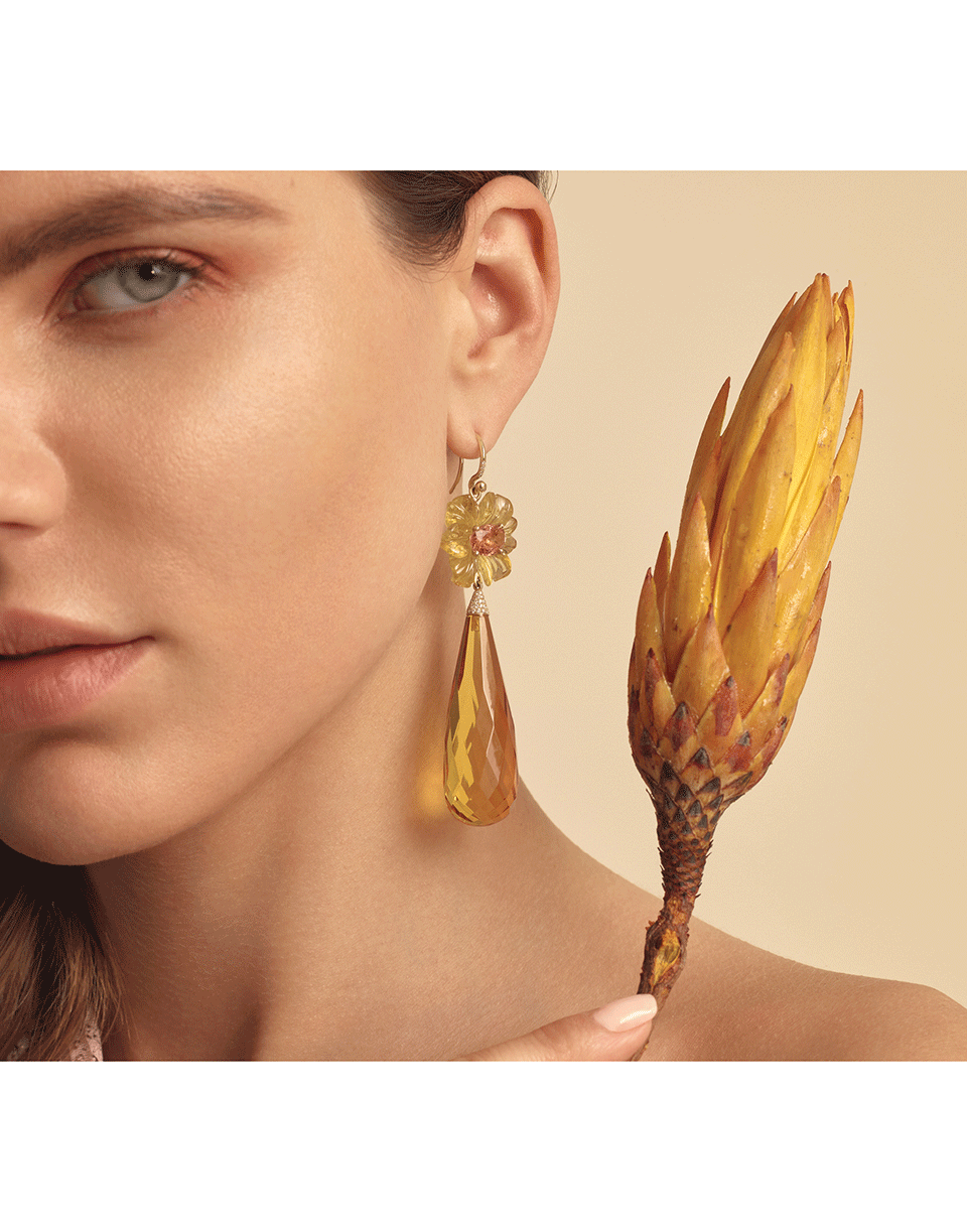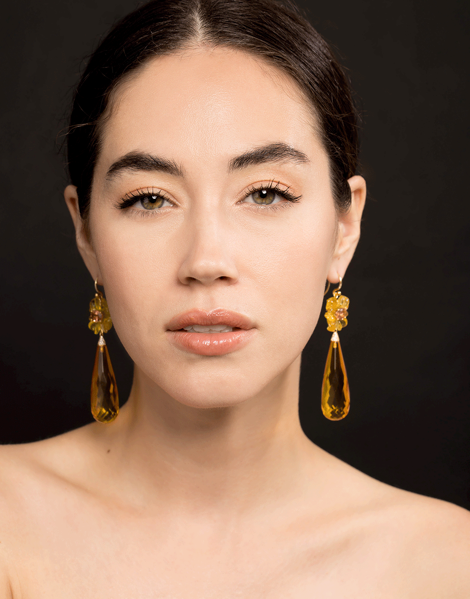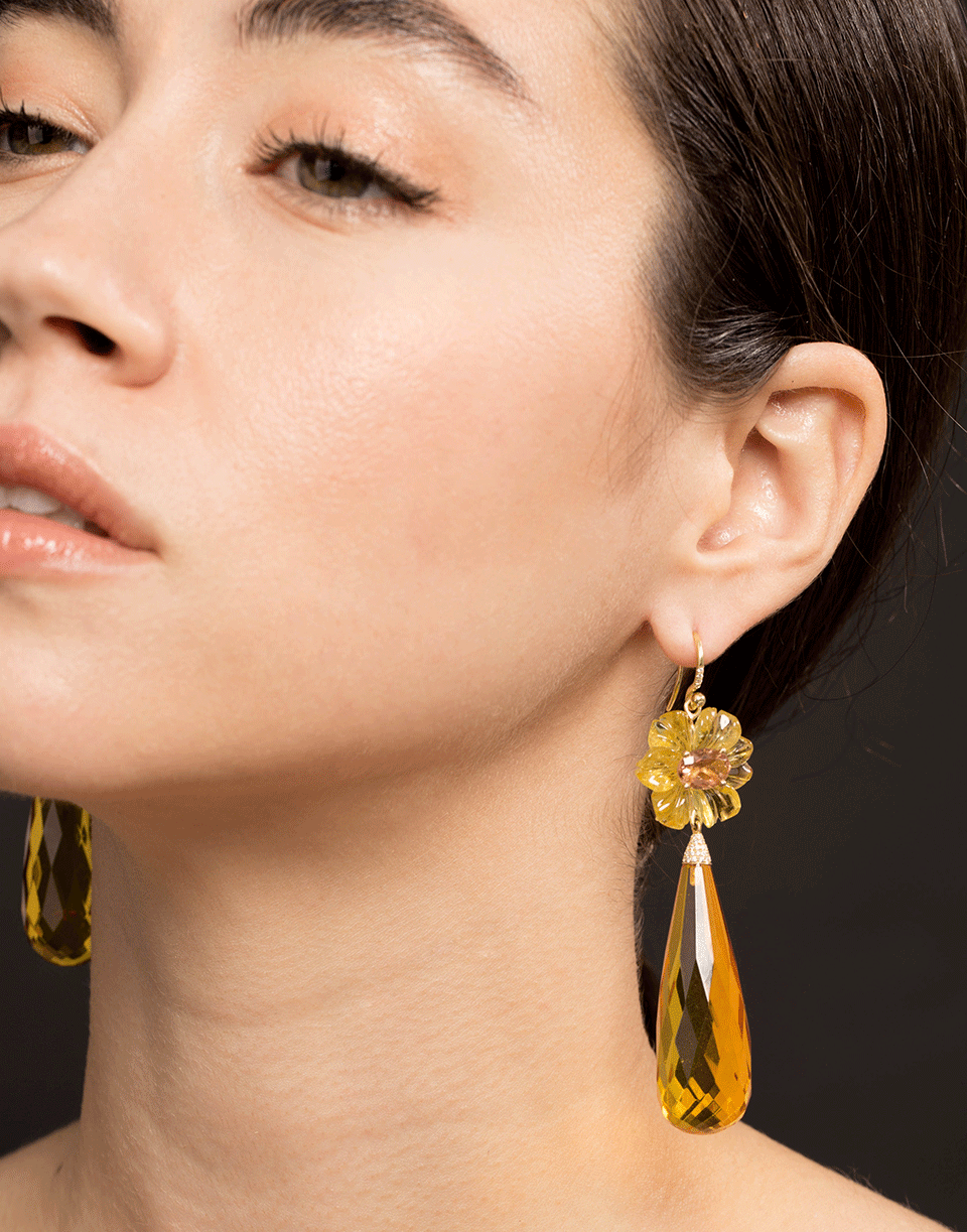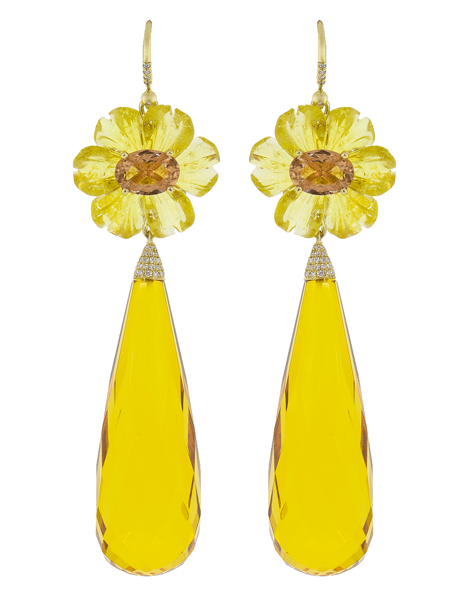 These stunning 18k Yellow Gold earrings by Irene Neuwirth feature a drop silhouette with a tourmaline stone set on a craved tourmaline flower and an amber teardrop with diamond pave tips. For pierced ears.