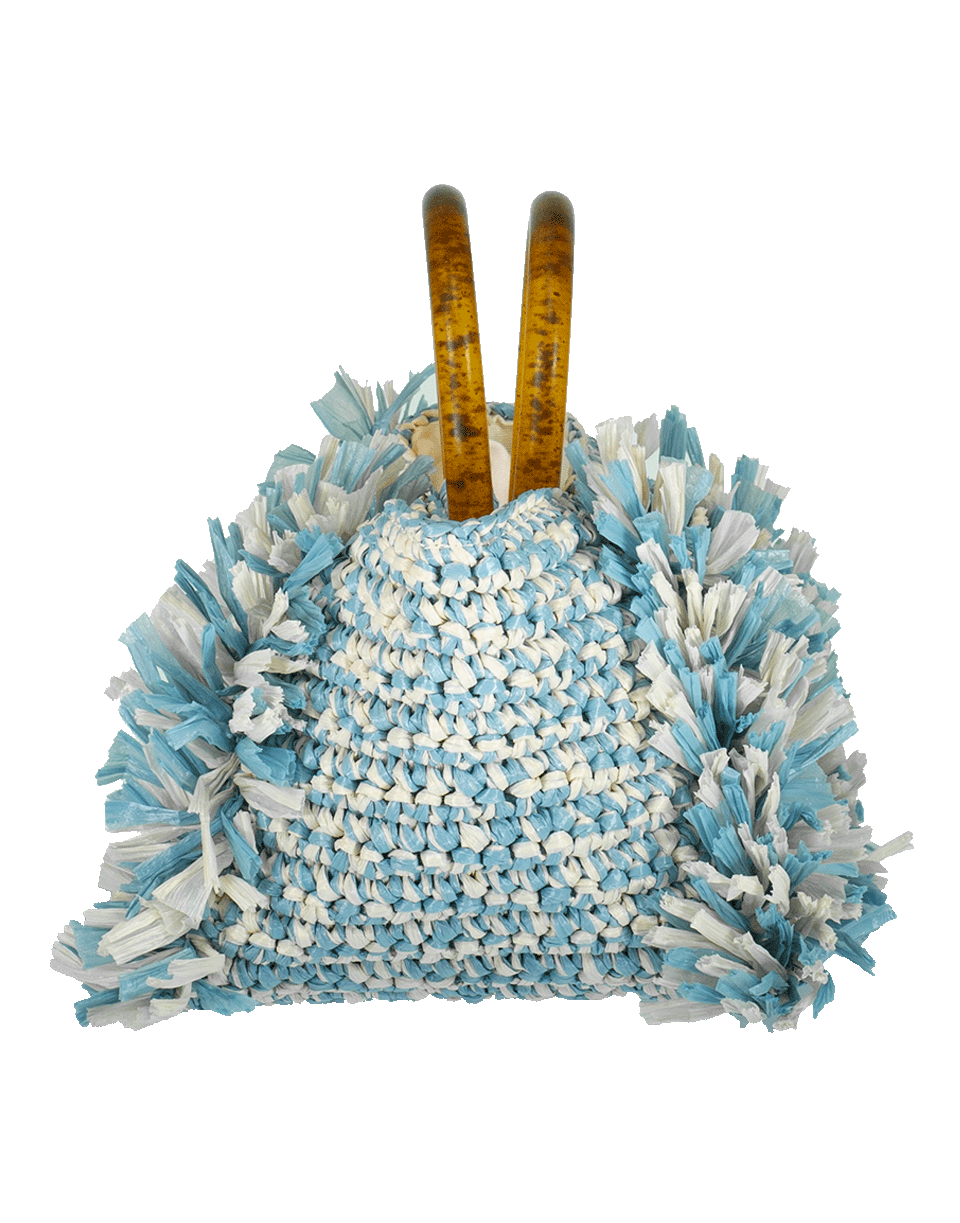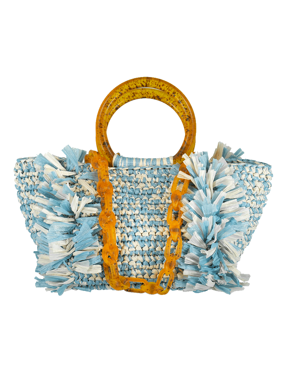 Two-tone raffia tote by Carolina Santo Domingo. This woven raffia tote with lucite circular top handles and chain strap features a frayed two-tone design, double ring handles, magnetic closure, interior zip pocket and a detachable 20” shoulder chain strap for ease of carry.