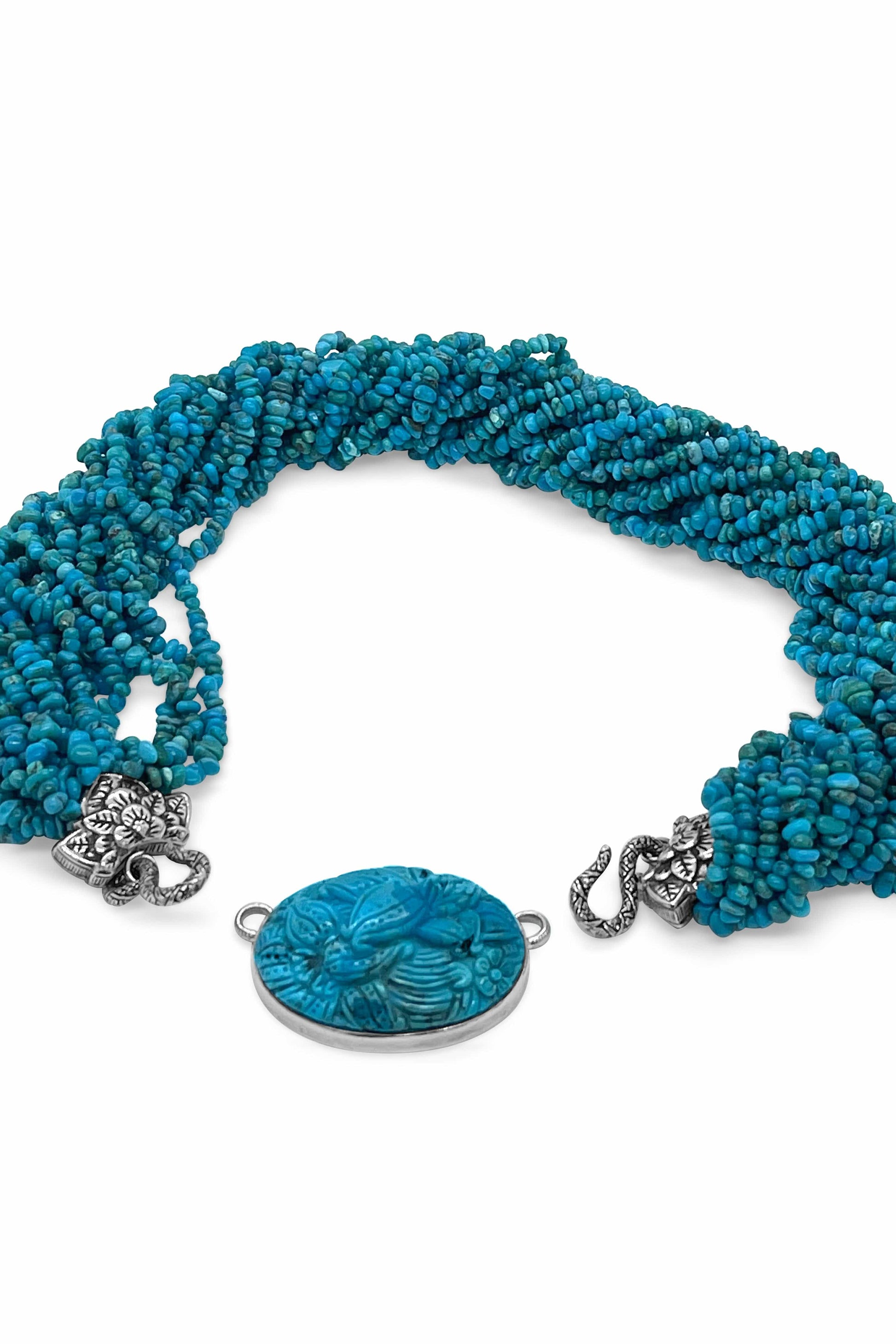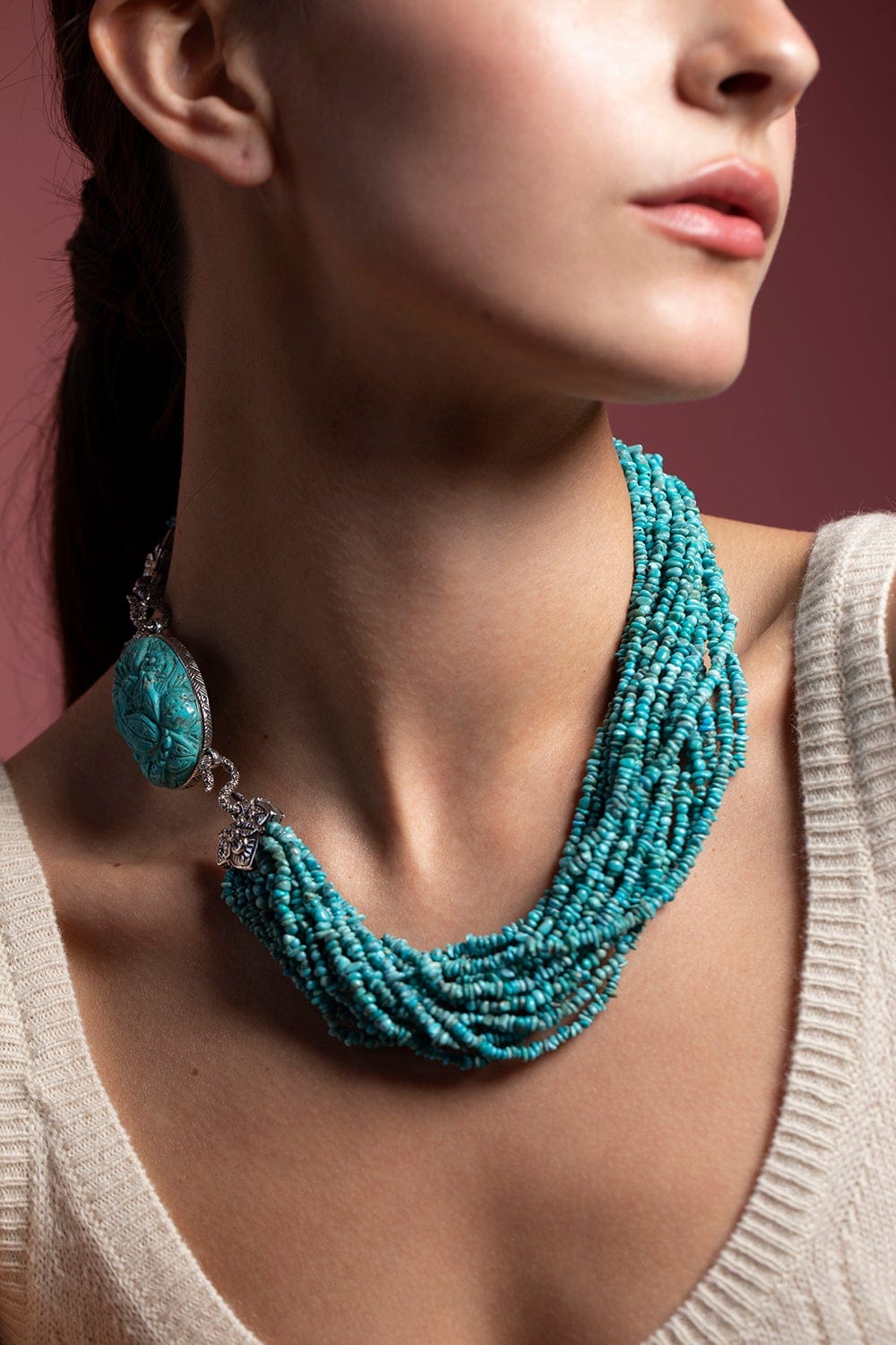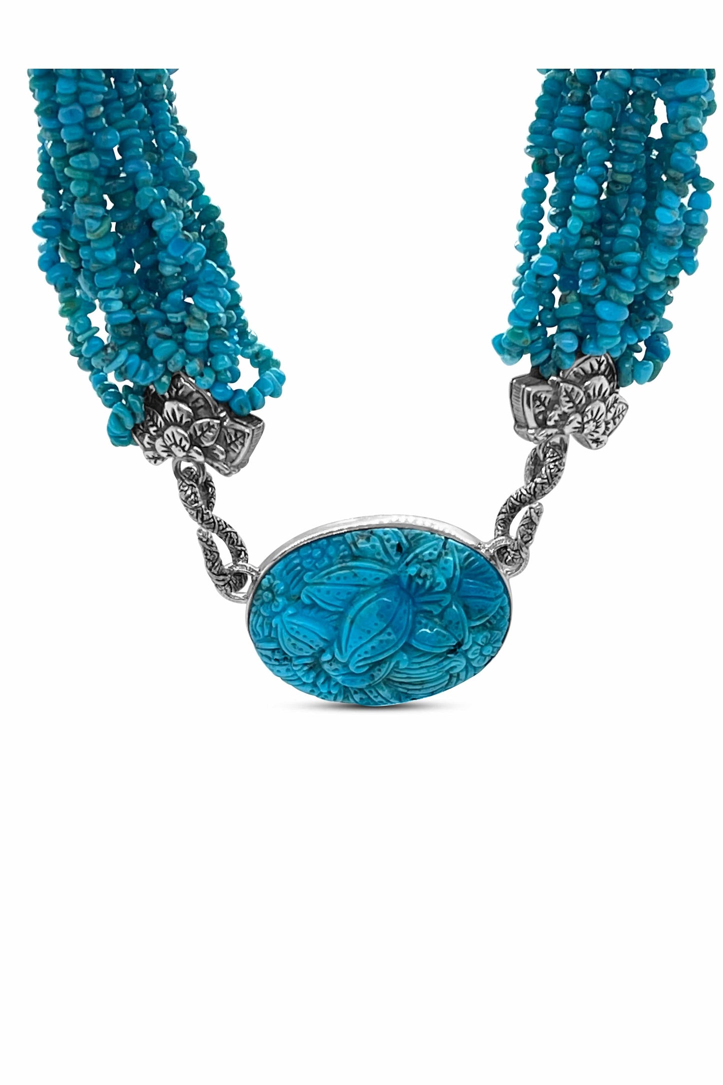 Stephen Dweck hand carved American turquoise center with multi strand American turquoise bead necklace.