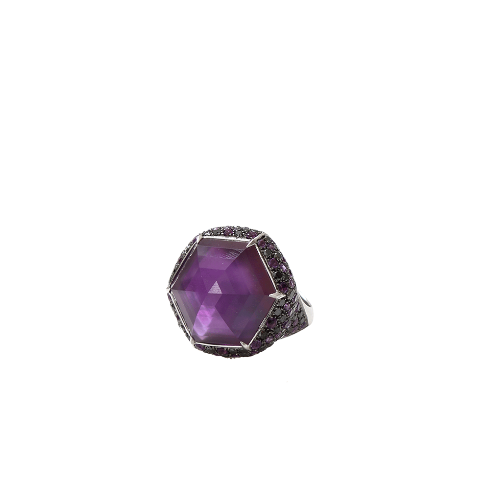 Amethyst Ring Over White Mother Of Pearl Center Stone With Purple Sapphire And Black Diamond Pave From Stephen Webster