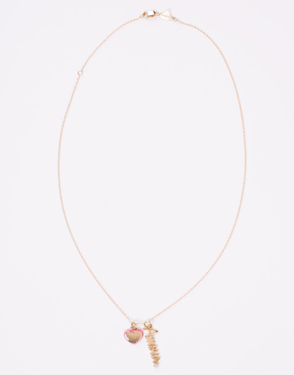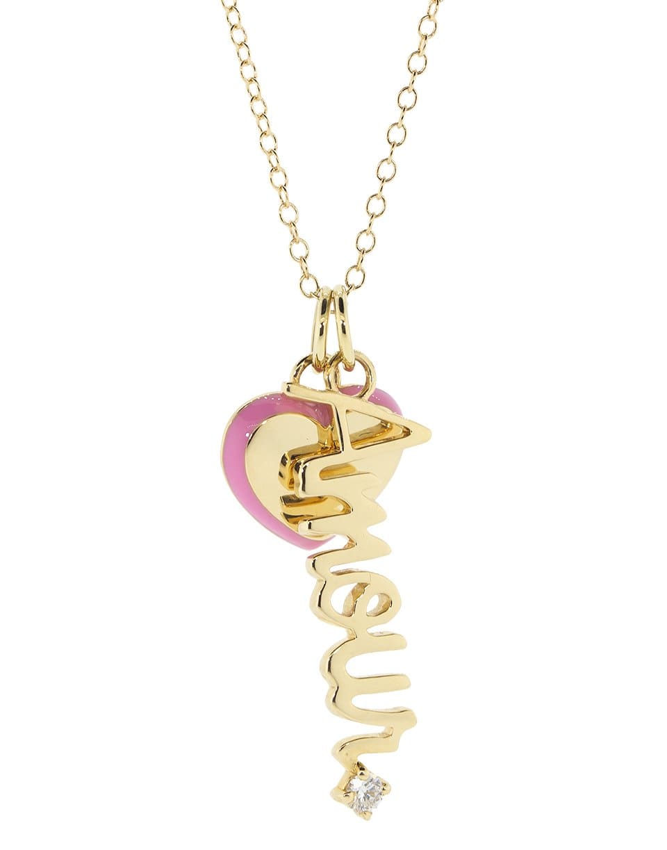 Alison Lou 'Amour' lettering and pink puff heart pendant necklace set in 14k yellow gold.