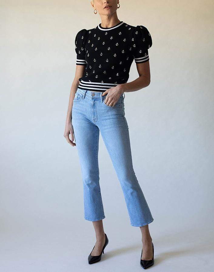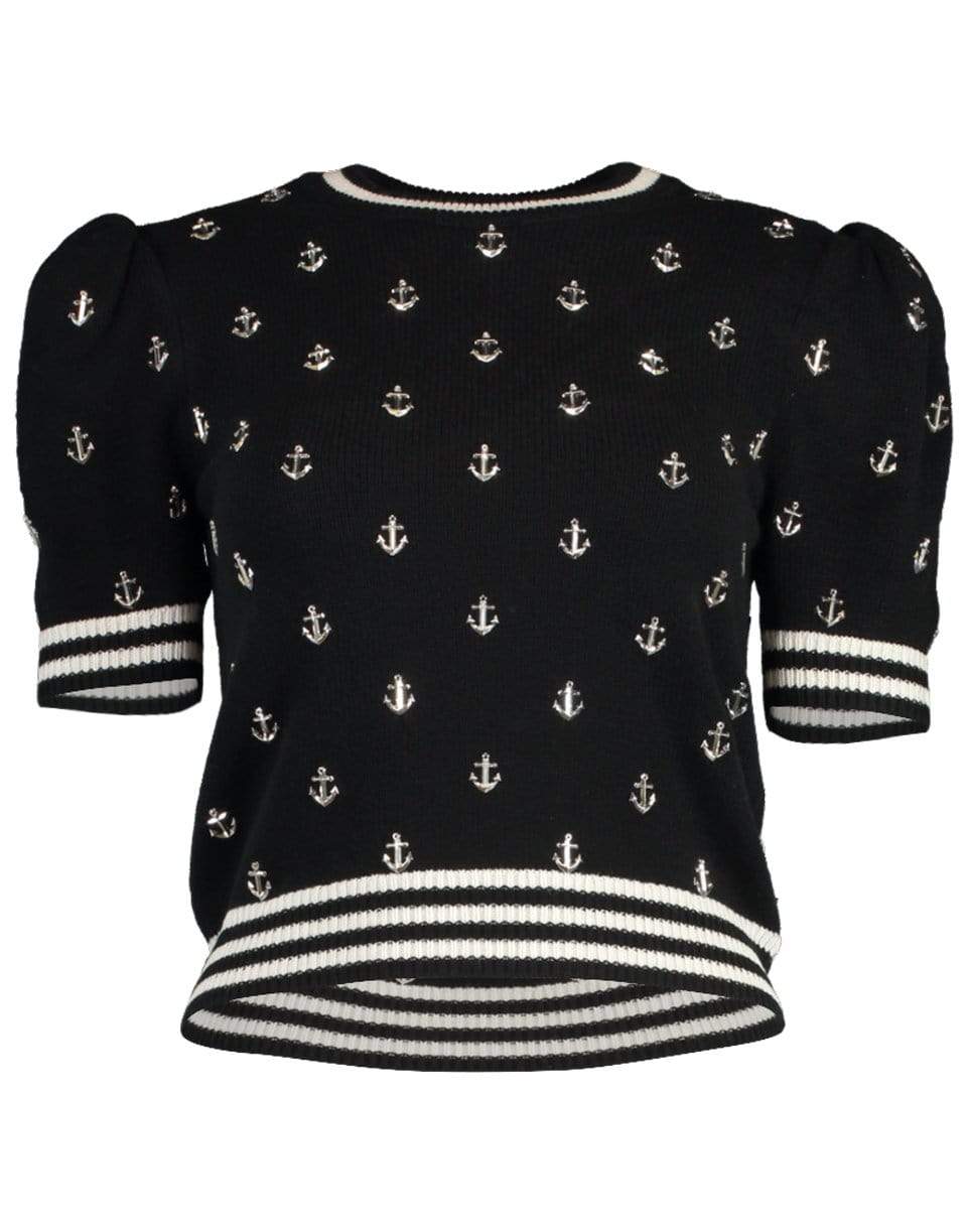 Michael Kors anchor embellished puf sleeve top with a slim fit, elbow length sleeves, round neck, and contrasting striped trim.