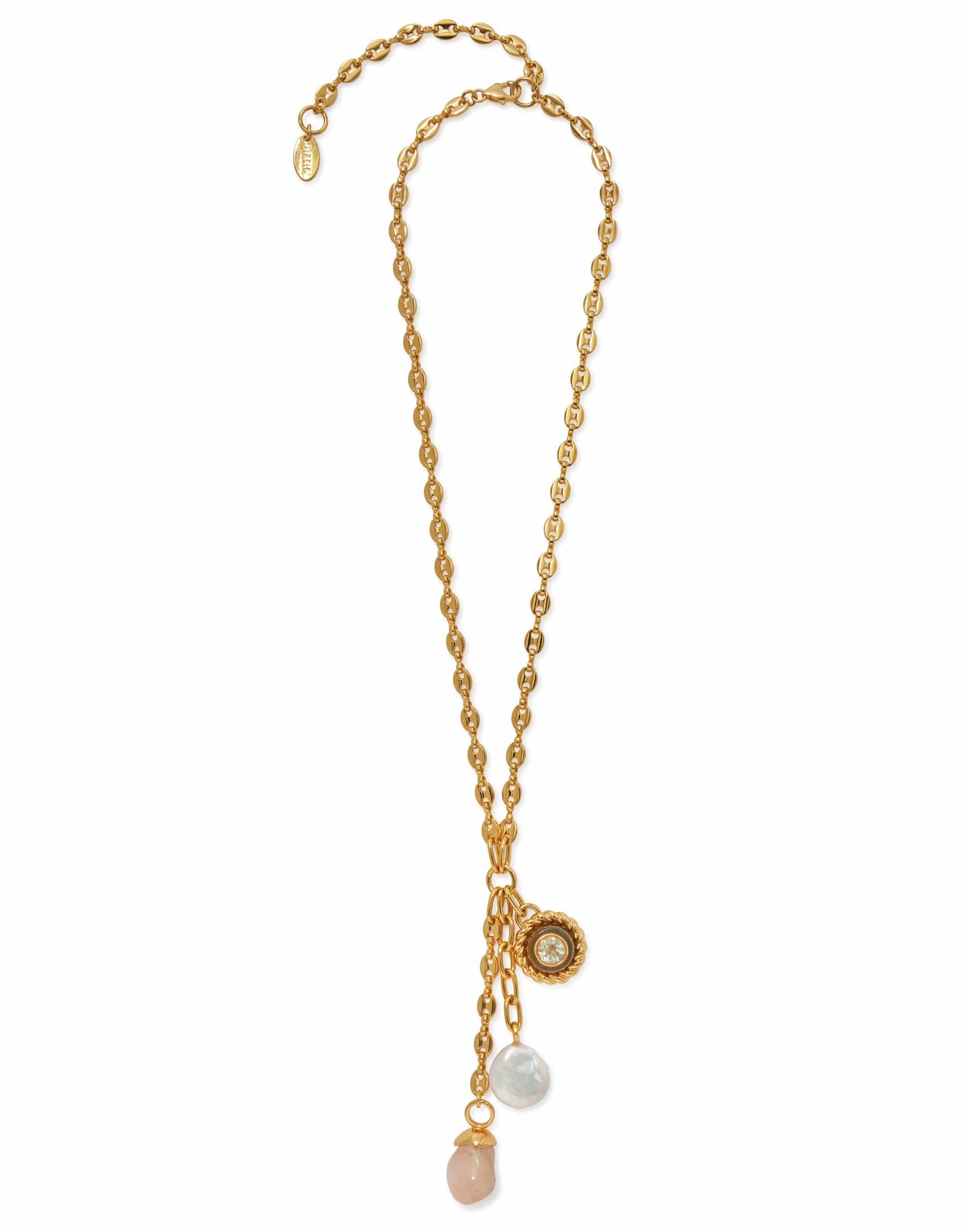 Lizzie Fortunato anchor lariat necklace. Gold-plated brass anchor chain "Y" necklace with hanging marbled pink acrylic drop, freshwater pearl, and gold-plated and tortoise acrylic charm set with semiprecious green amethyst.