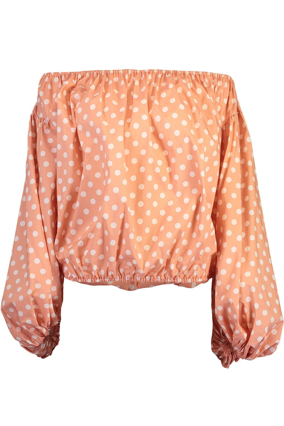 Caroline Constas off the shoulder andros top in blush white polka dot.