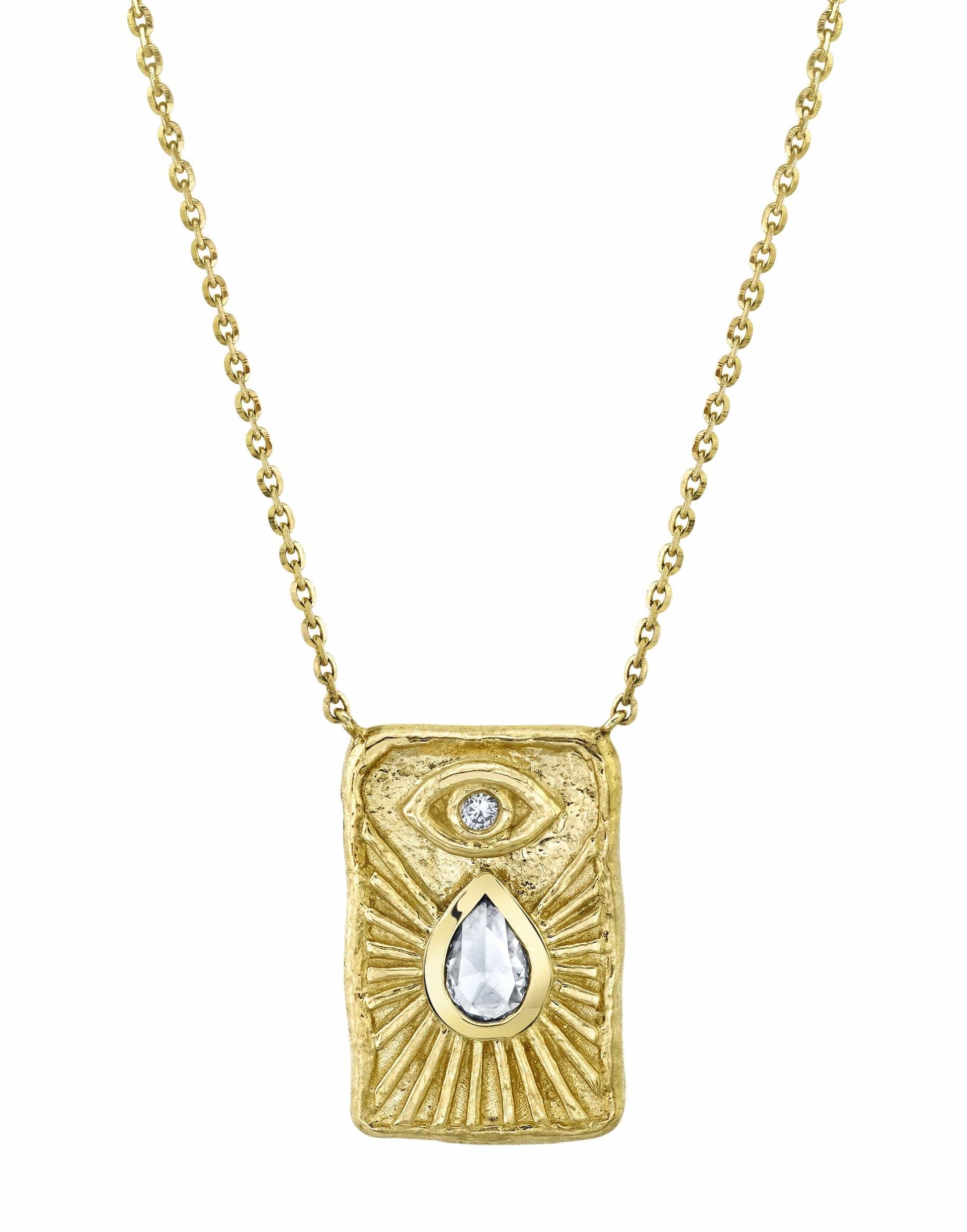 Logan Hollowell angel eye shield necklace. 14k gold rectangular hand-carved pendant necklace with water drop moonstone shield center.
