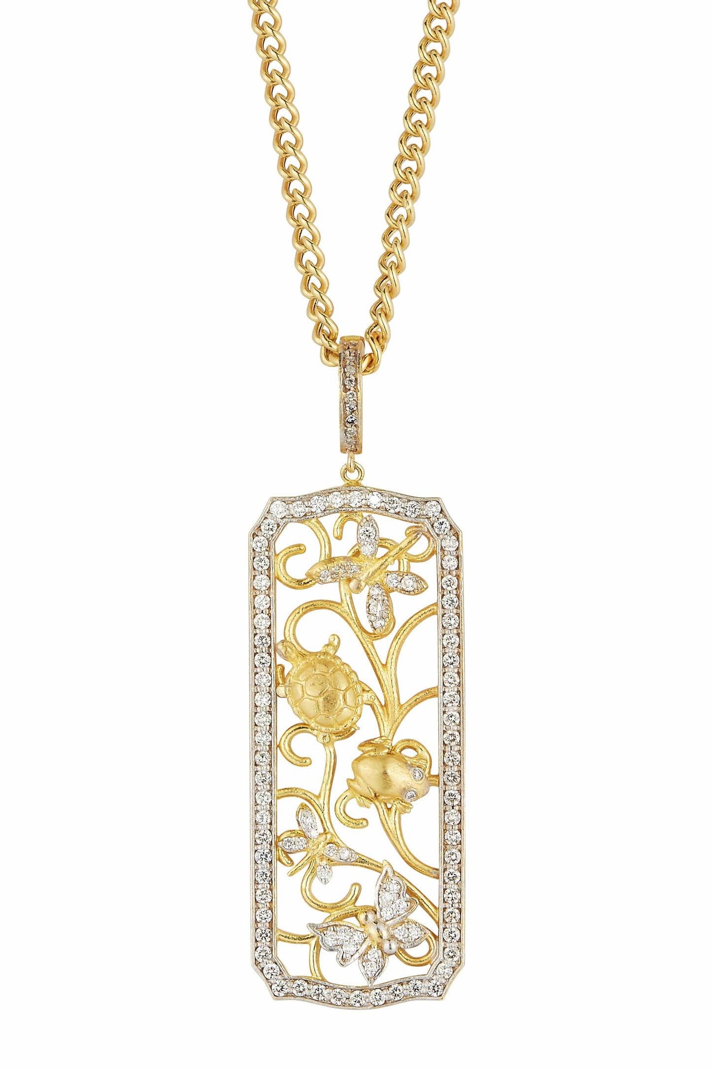 Tanya Farah garden of eden vertical scroll diamond animal dogtag pendant with diamond bail.