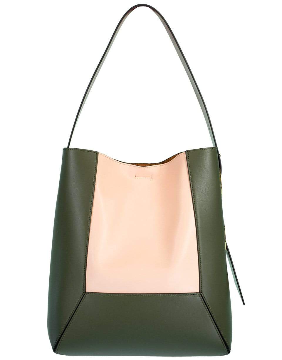 Marni color blocked Nemo Tote featuring a contrasting shoulder strap, magnetic snap closure, gold-tone side grommets, an exterior pocket, and a spacious interior with a side pocket..