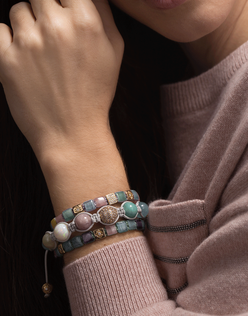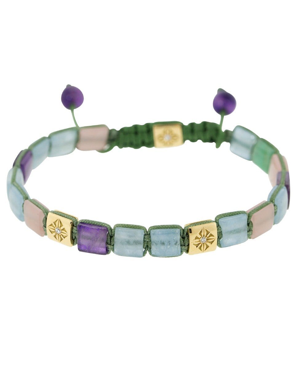 Adjustable Shamballa diamond lock bracelet with emerald, cape amethyst, milky aquamarine, and guava quartz.