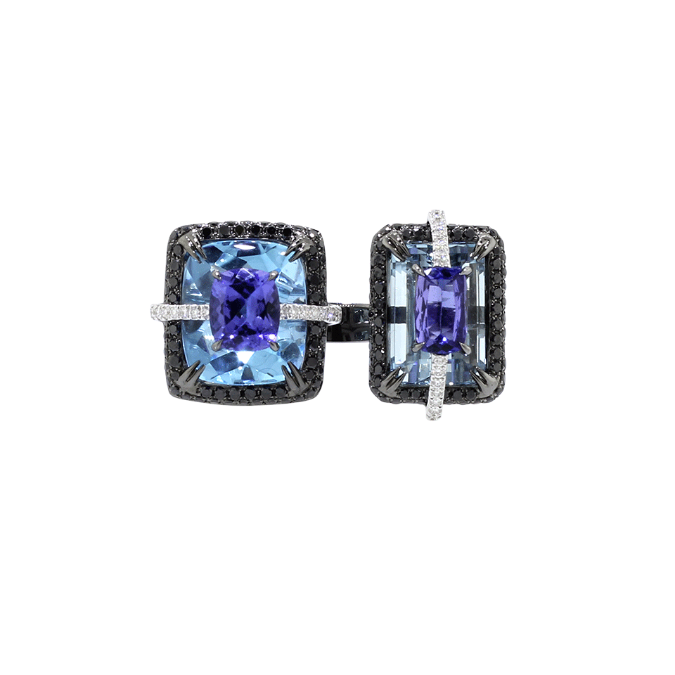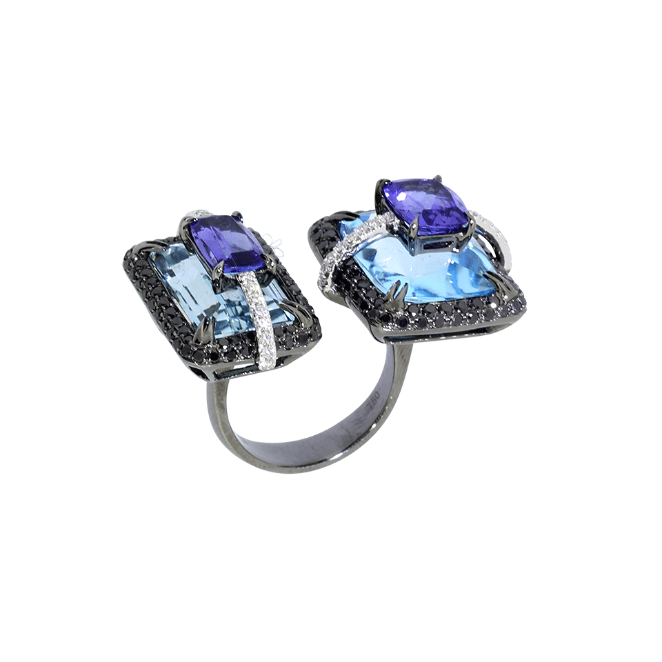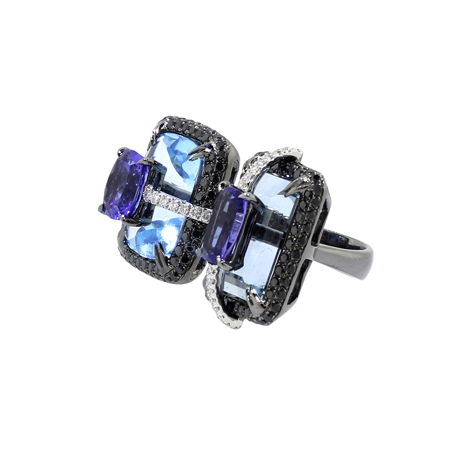 Aquamarine (12.38 CTW), Topaz (12.94 CTW), Tanzanite (3.46 CTW), White Diamonds (0.25 CTW), Black Diamonds (1.41 CTW)