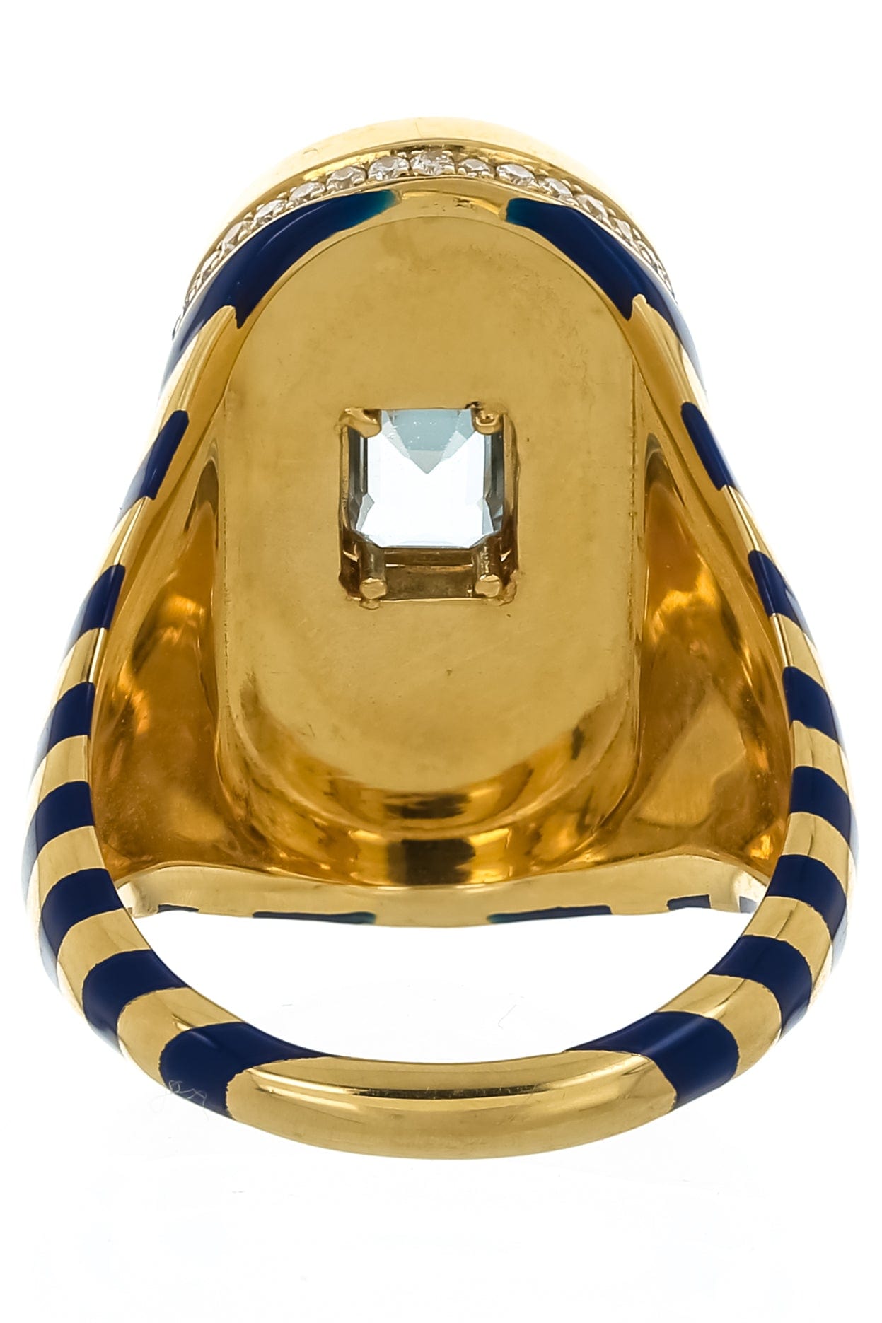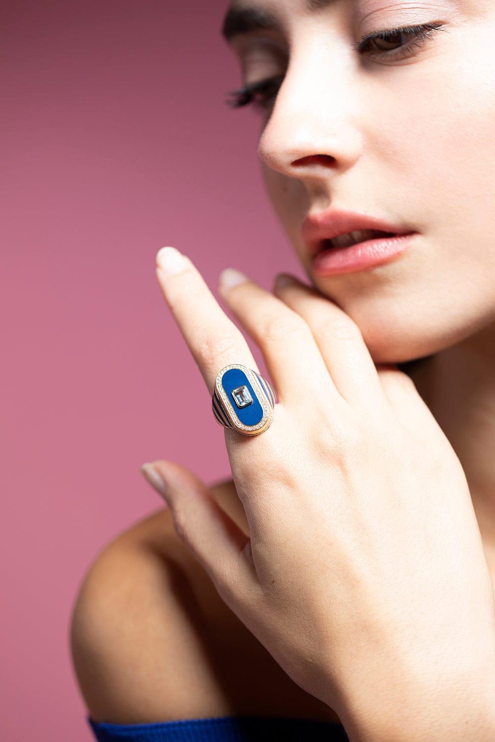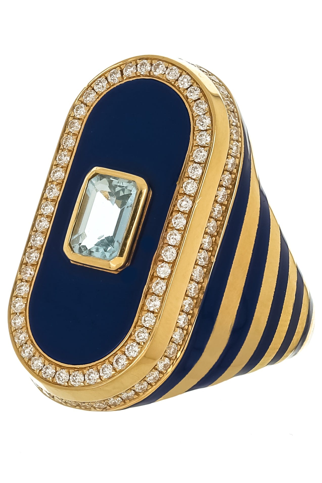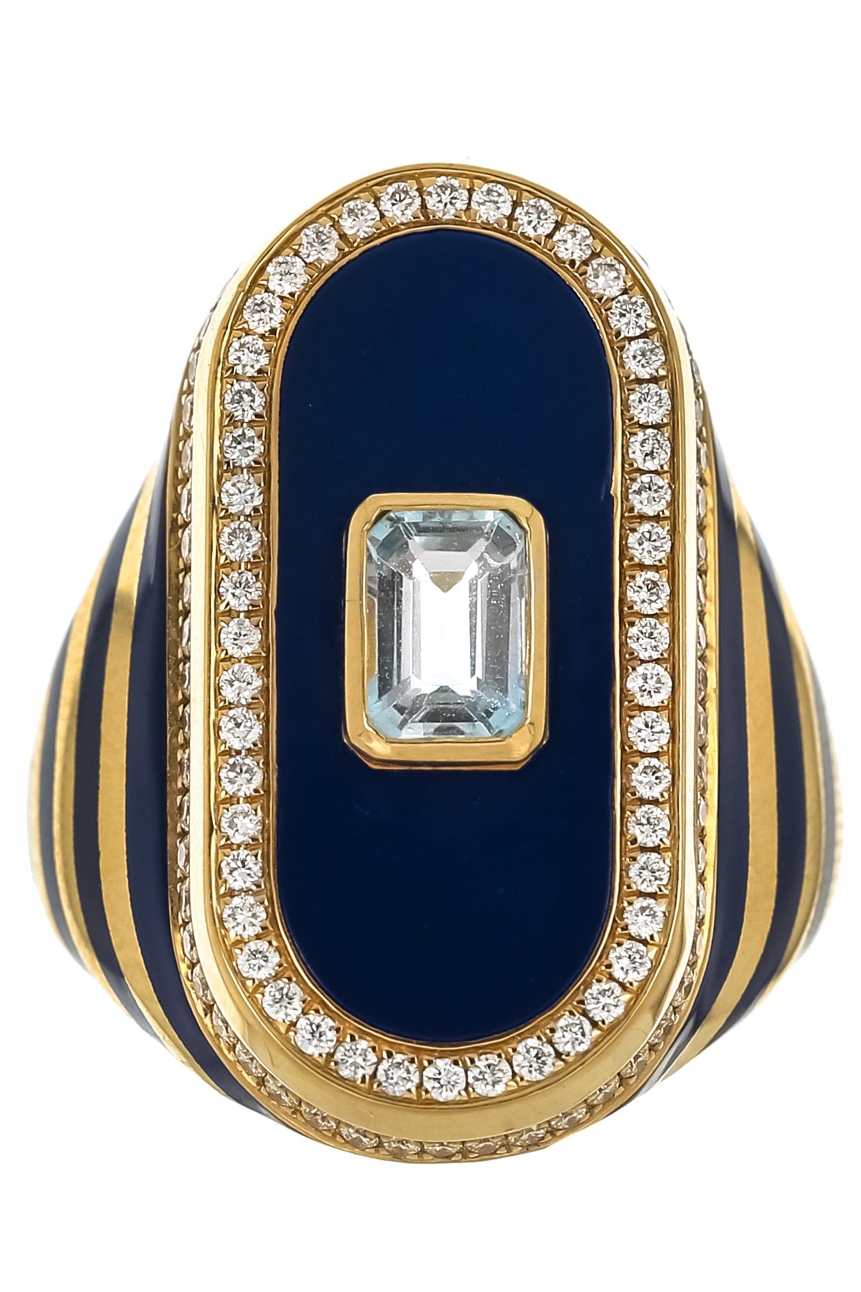 State Property navy enamel aquamarine battuta ring. The Battuta Ring creates a solid form with a signature State Property silhouette. Coloured enamel stripes towards an elliptical centre, crowned with an emerald-cut centre stone. Never short of fun colours, this is the ring for a burst of bright and bold energy.