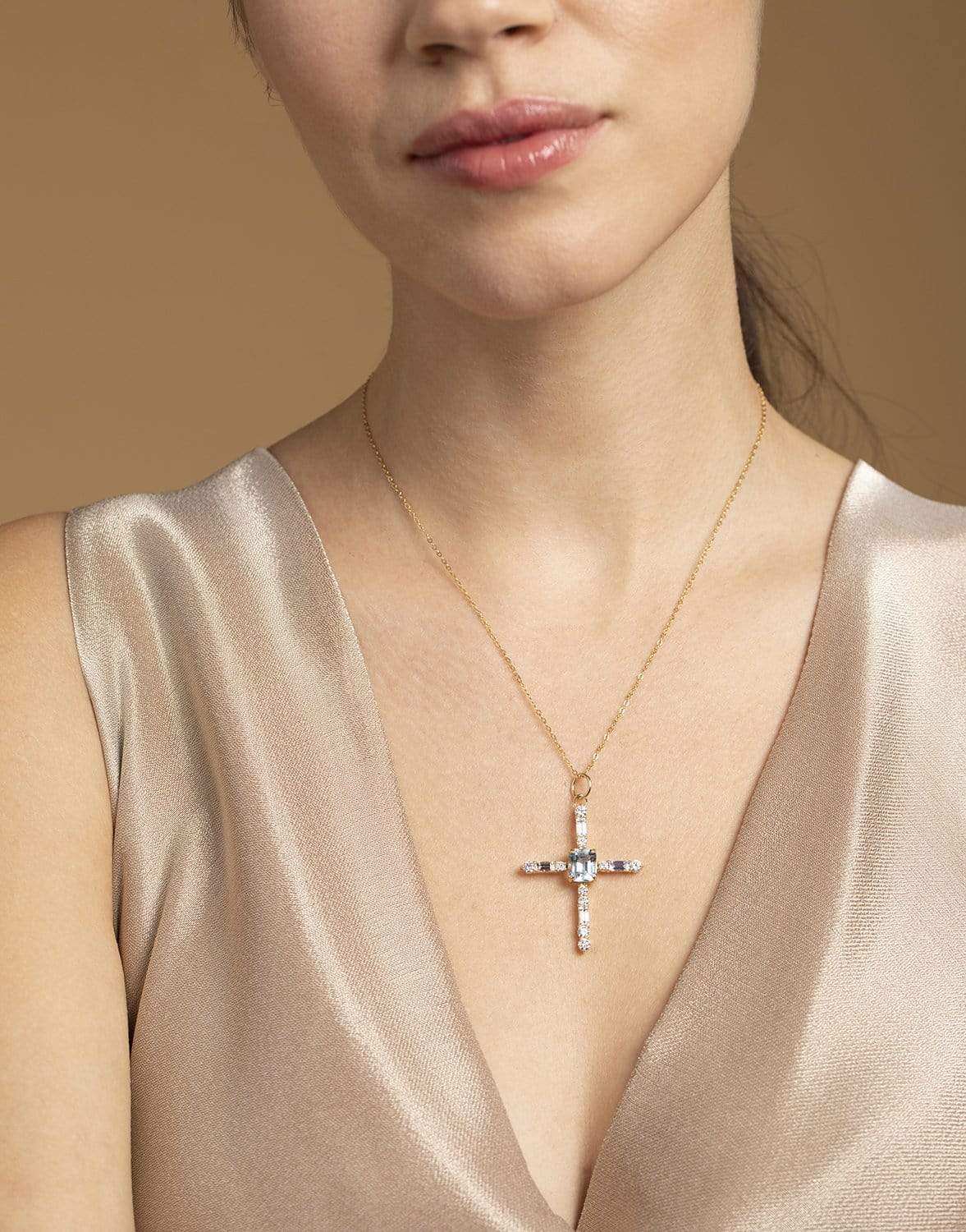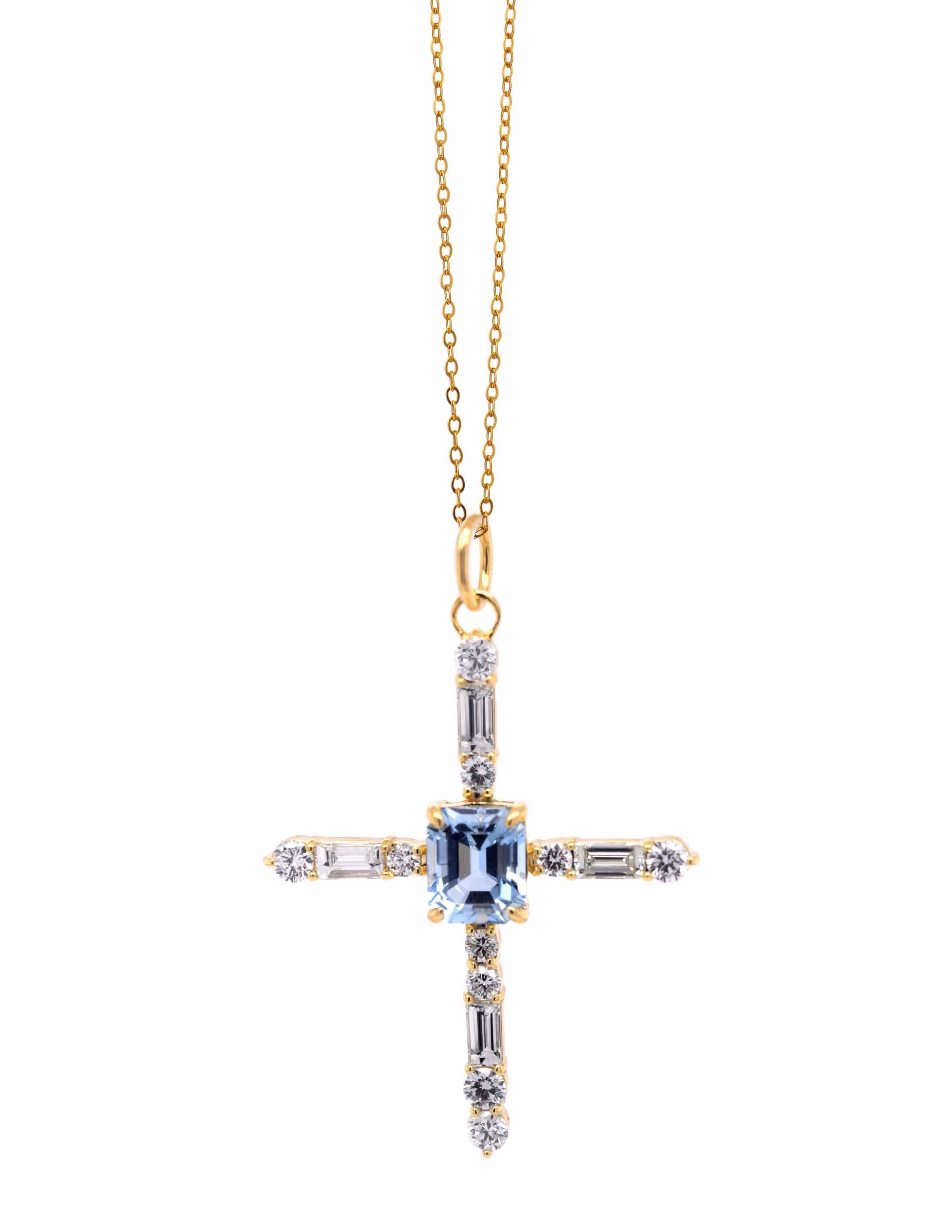 Monica Rich Kosann special edition 18k yellow gold cross charm with Brazilian aquamarine and round and baguette diamonds.