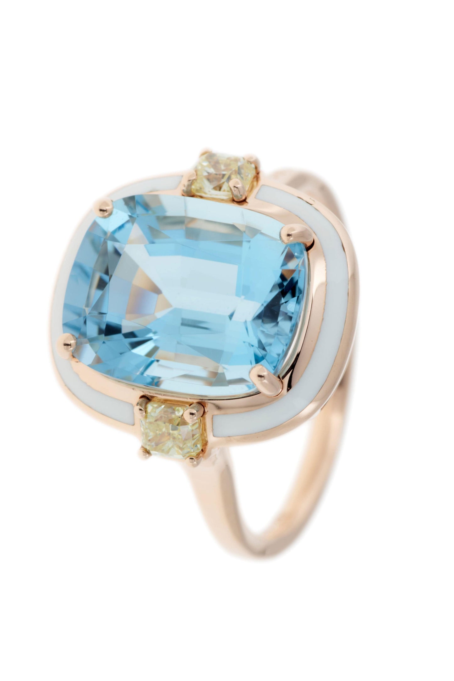 Selim Mouzannar pink gold and ivory enamel gemma ring set with aquamarine and yellow diamonds.