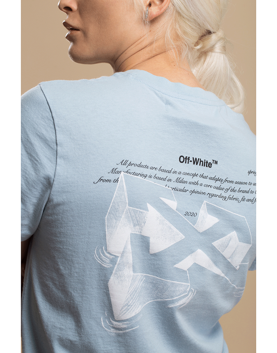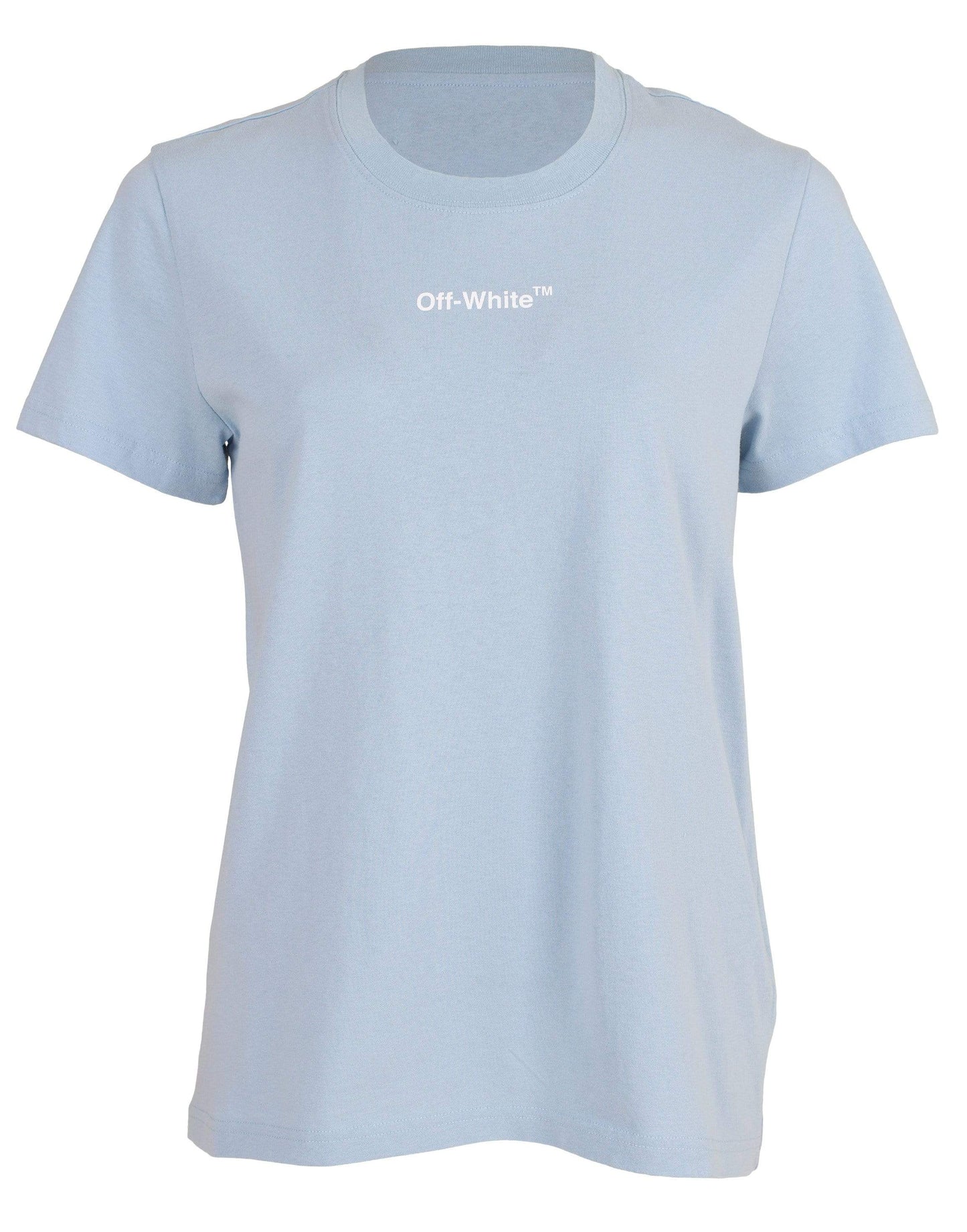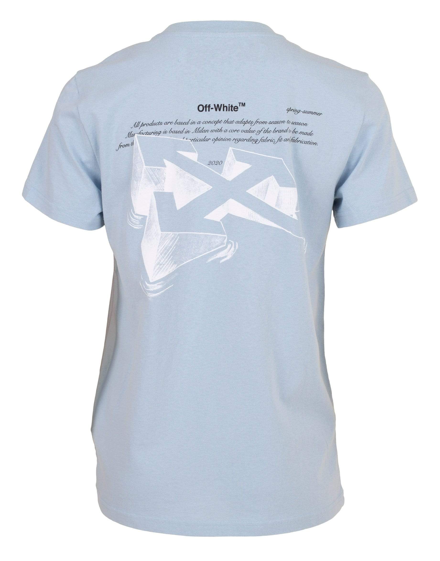 Off-White pale blue arrows sketch T-shirt with short sleeves, logo at front, and a crewneck.