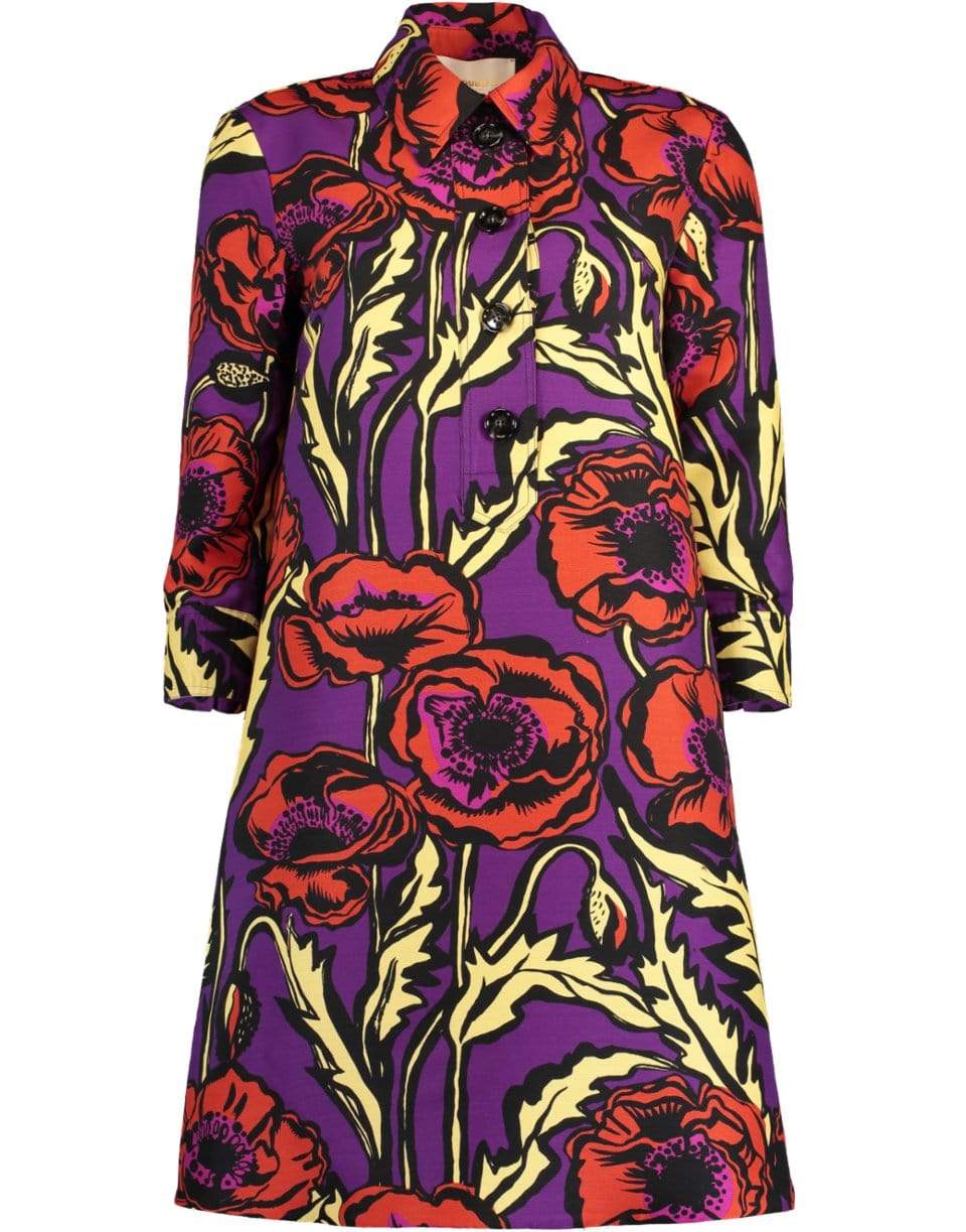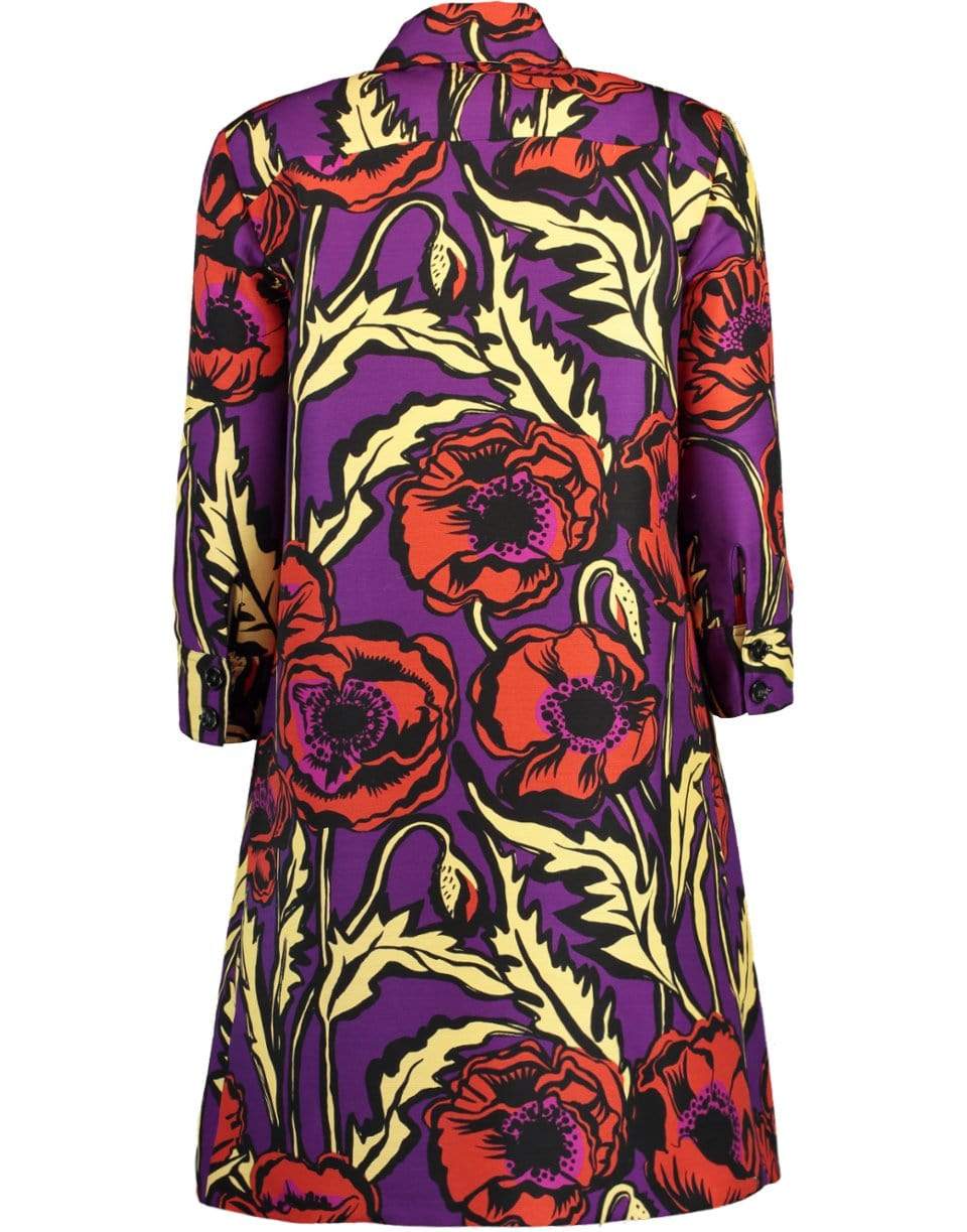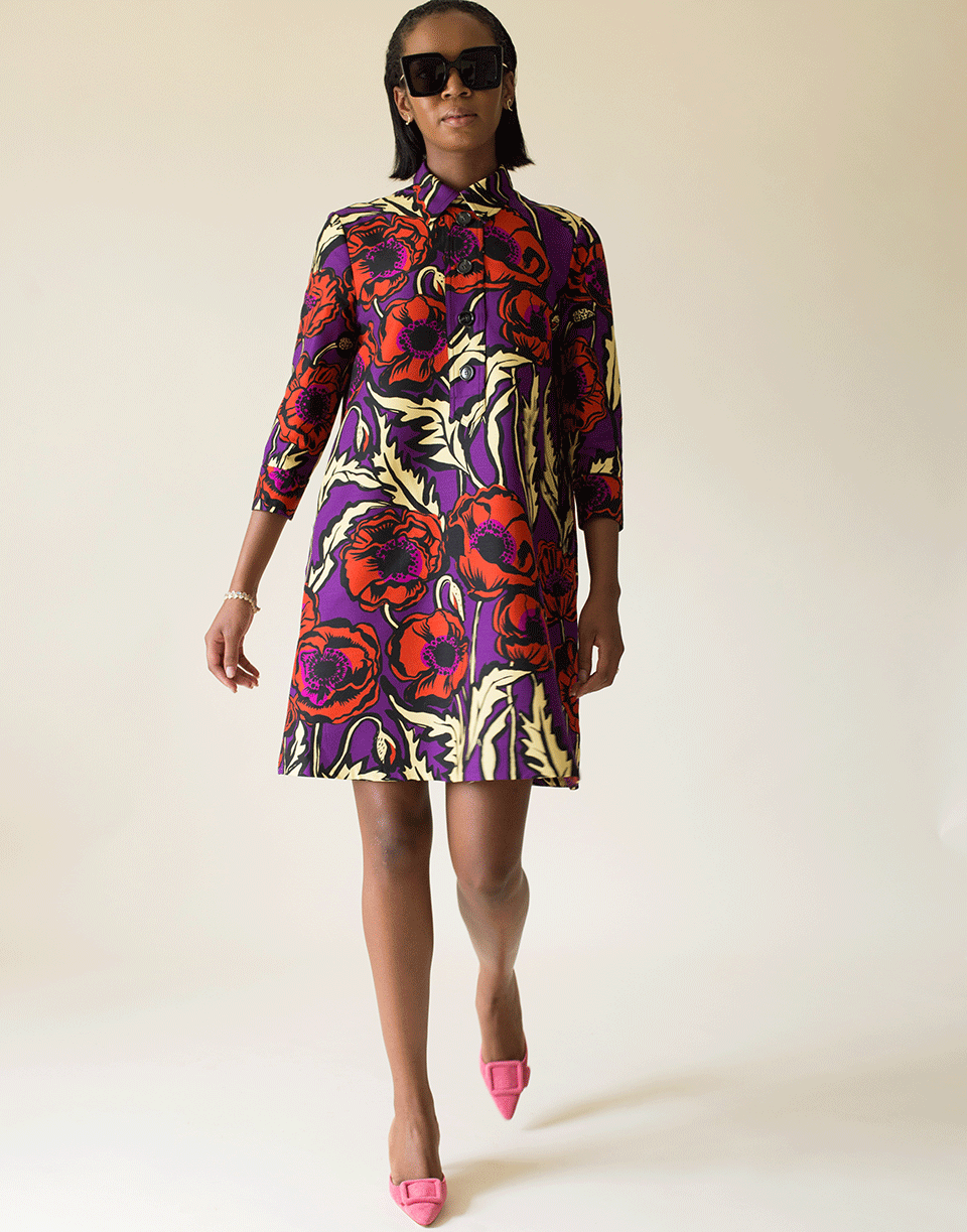 La DoubleJ cady wool floral Artemis shift dress with 3/4 length sleeves, spread collar, half button front placket, side pockets, and a knee length.