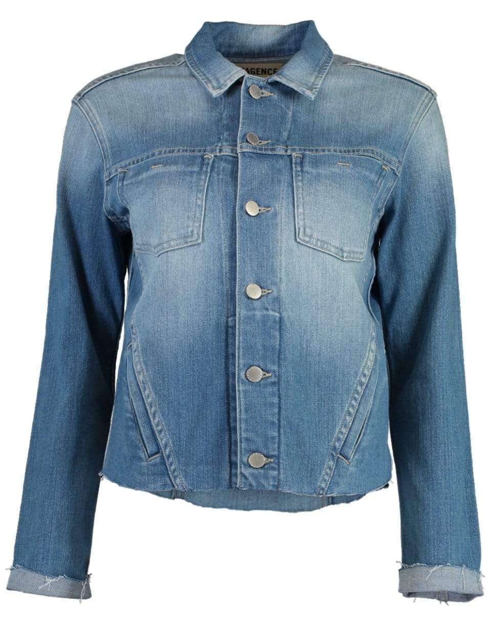 L'Agence ight blue denim jacket with a feminine fit and an ultra-soft feel. Luxurious stretch denim hugs the body while allowing complete freedom of movement. Timeless design elements include a classic collar, double chest pockets, and a clean silver button closure. Slimming tapered seams and a raw, ravaged hem add a modern edge.