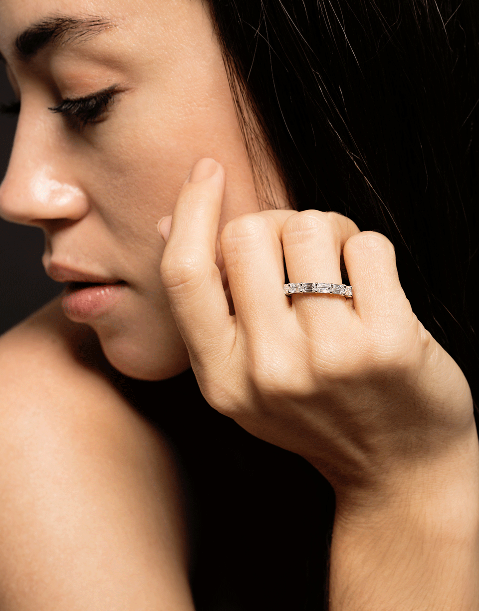 Say YES to the Ashoka diamond band by Kwiat. From the Ashoka Diamond collection, this platinum band features an eternity style with horizontal set Ashoka diamonds finished with the exact same proportions and dimensions. Its light and delicate low-profile gives it a modern feel with a twist on the classic style.